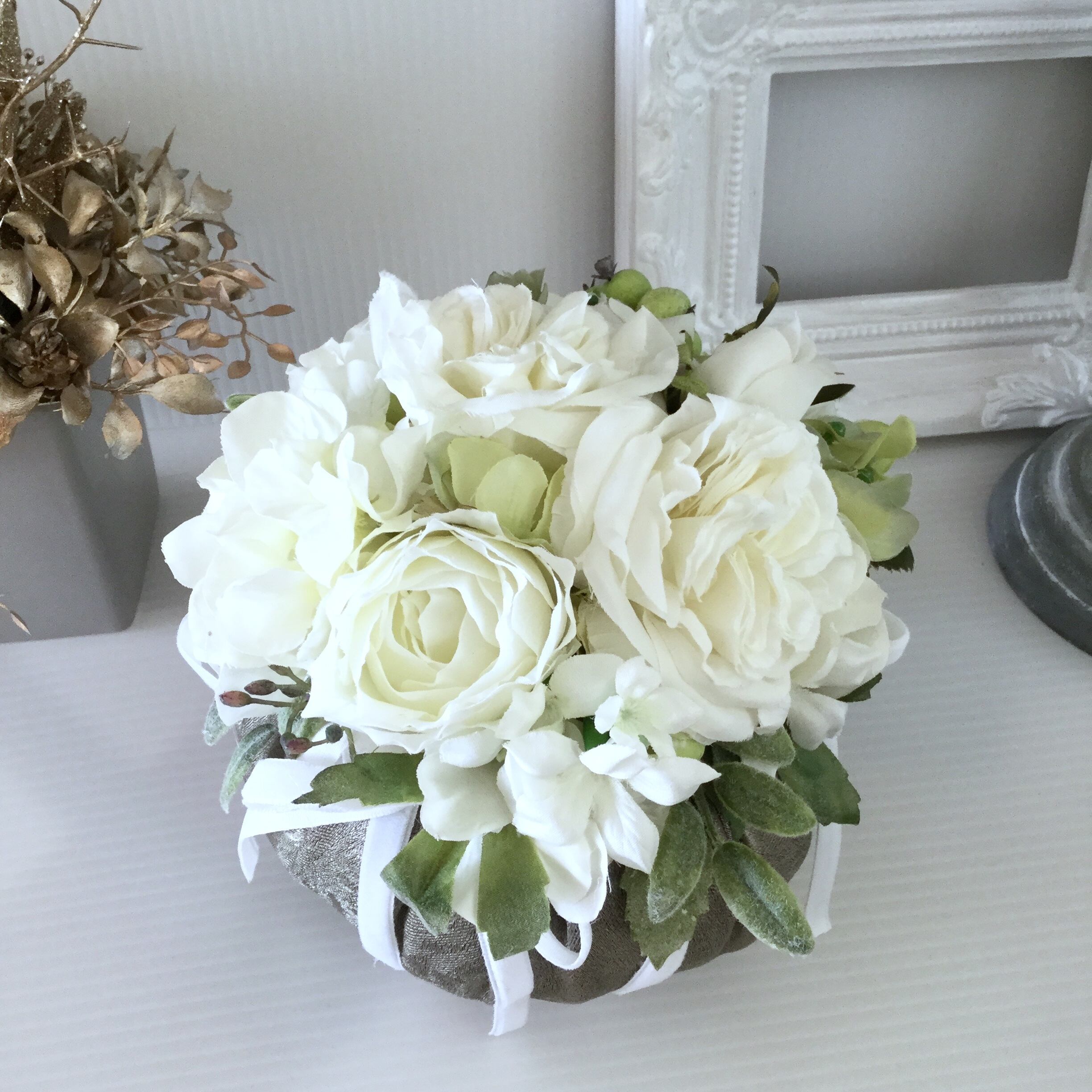 ホワイトローズをメインに小花 アジサイ グリーン ベルベットリボンで飾った