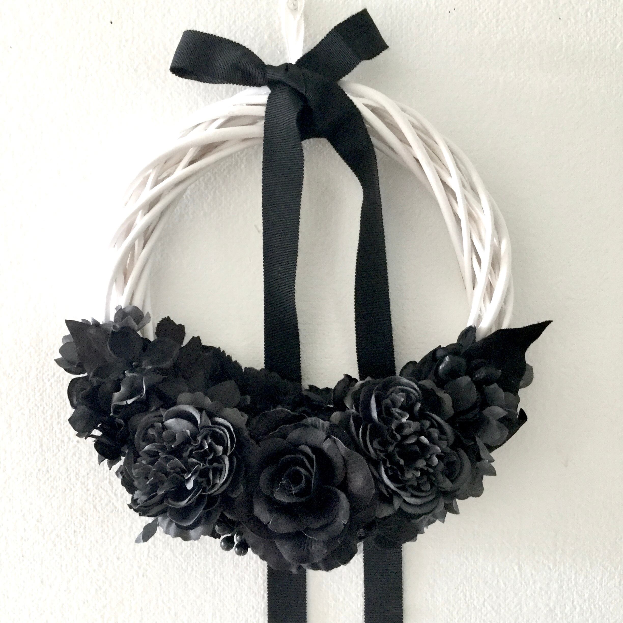 ホワイトのリース土台とブラックのお花 長くたらしたグログランリボンもエレガントな大人可愛いリースです。