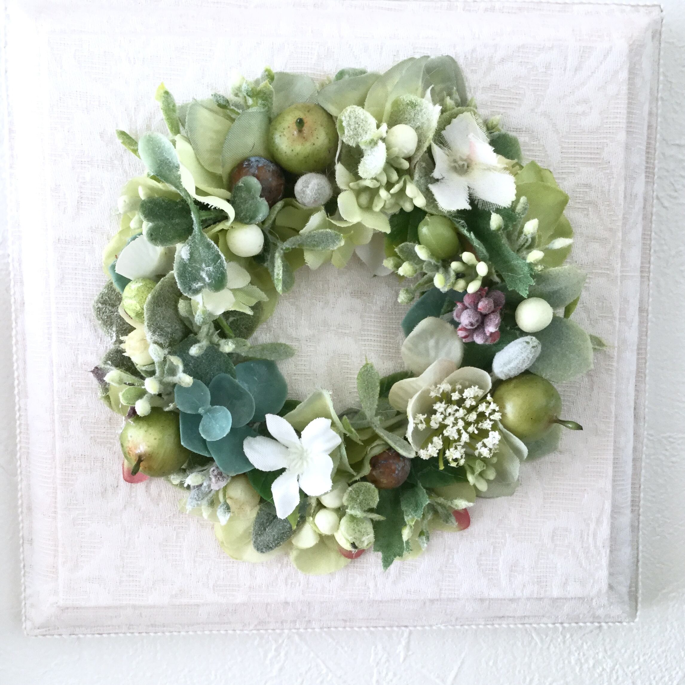 小花を散らしたグリーン系のフラワーリースのフレームアレンジメントです。