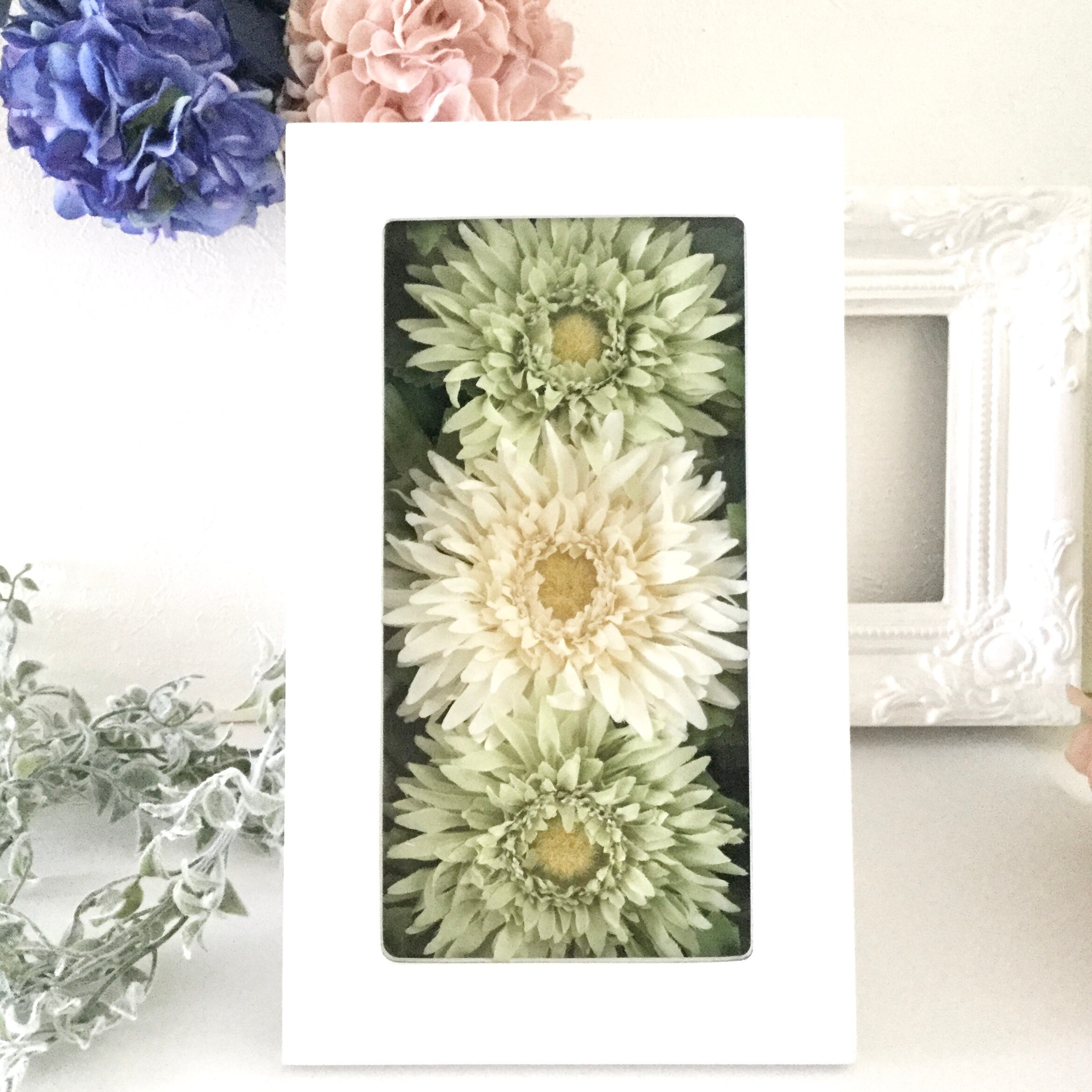 優しいグリーンとクリームのガーベラがモダンで可愛いフレームアレンジメント です。