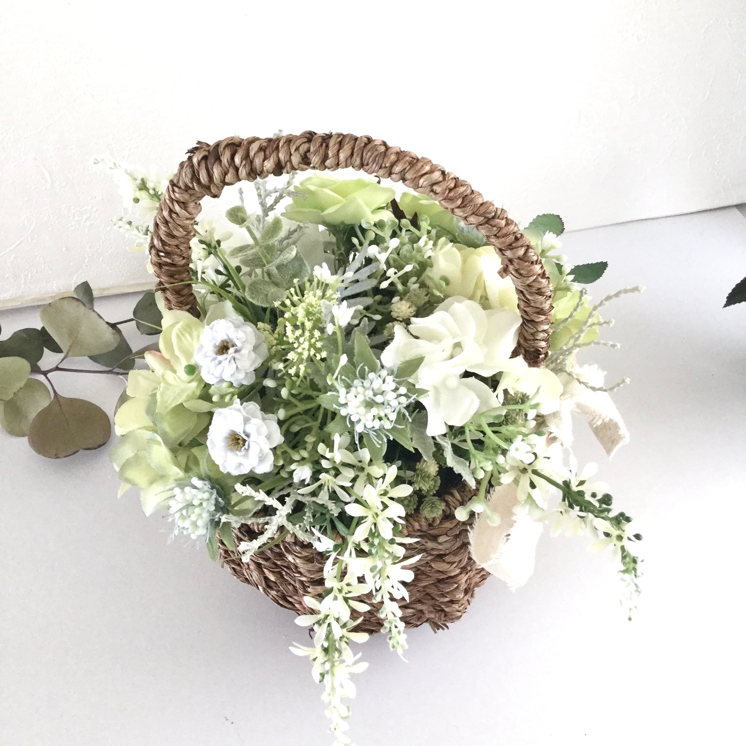 丸いバスケットにグリーンとホワイトのお花をアレンジしました。
