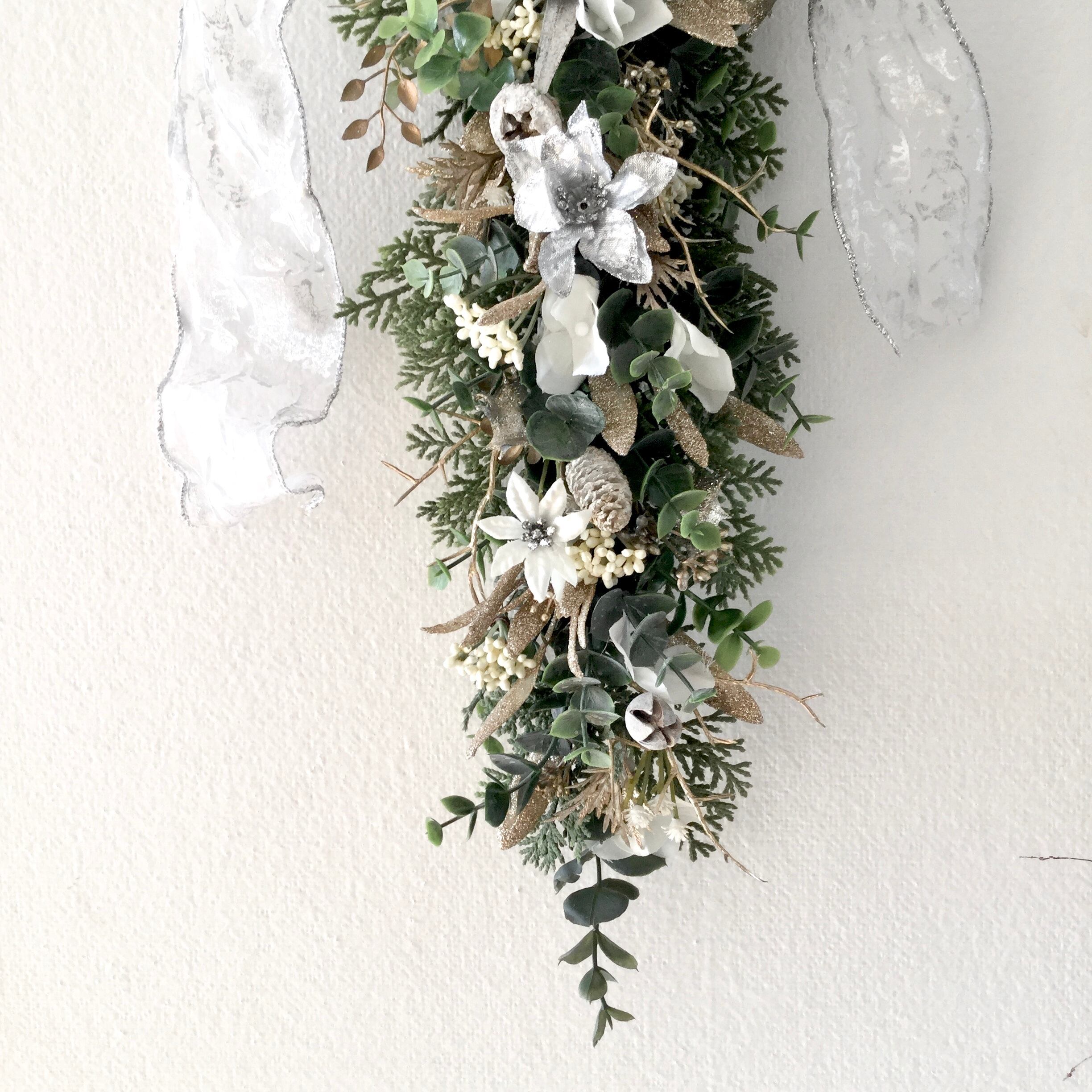 ユーカリなどグリーンとシルバーポインセチア 合間にゴールドリーフと木の実を散らして華やかに仕上げました。