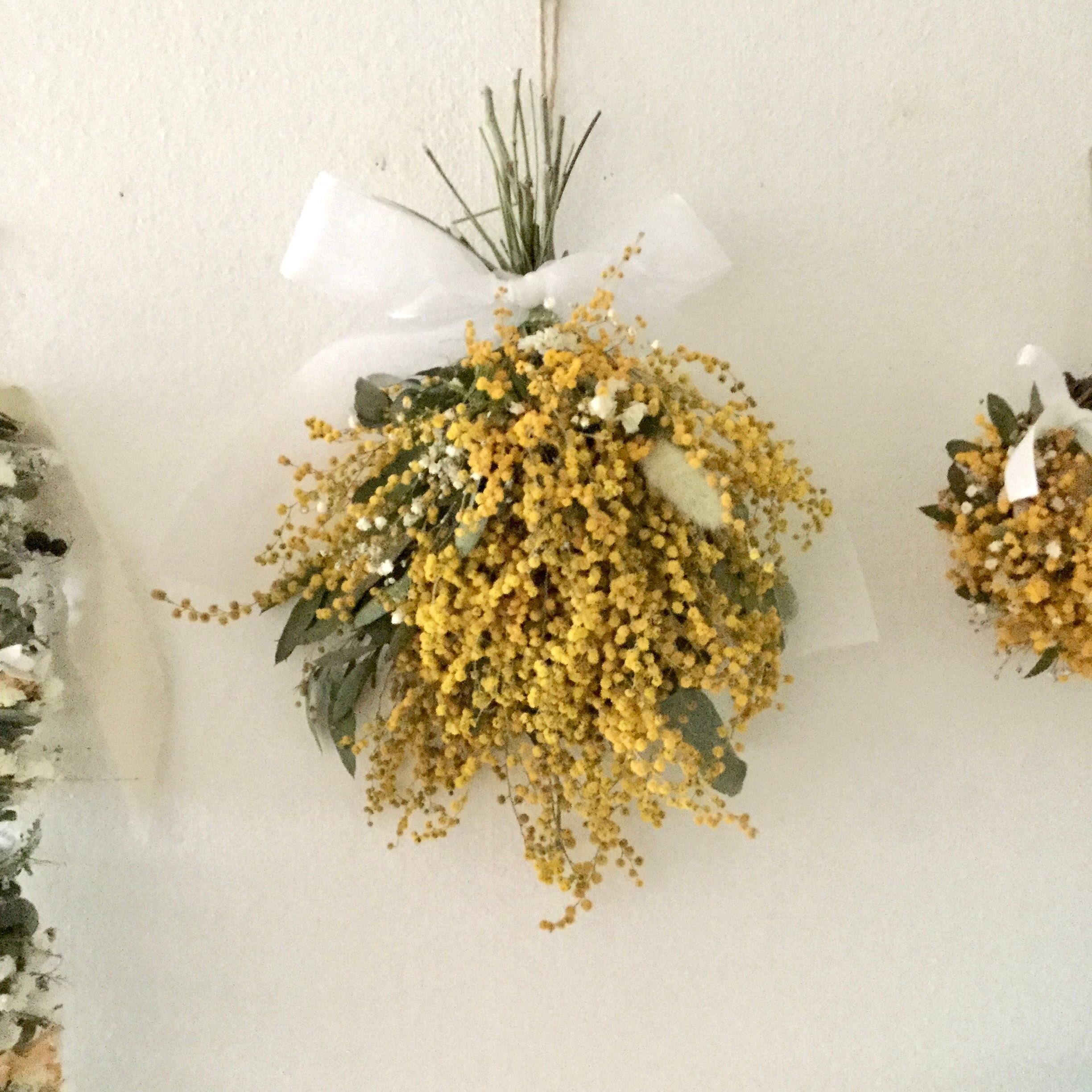 ユーカリと春の訪れを告げるミモザ かすみ草をふわっとまとめたスワッグです。