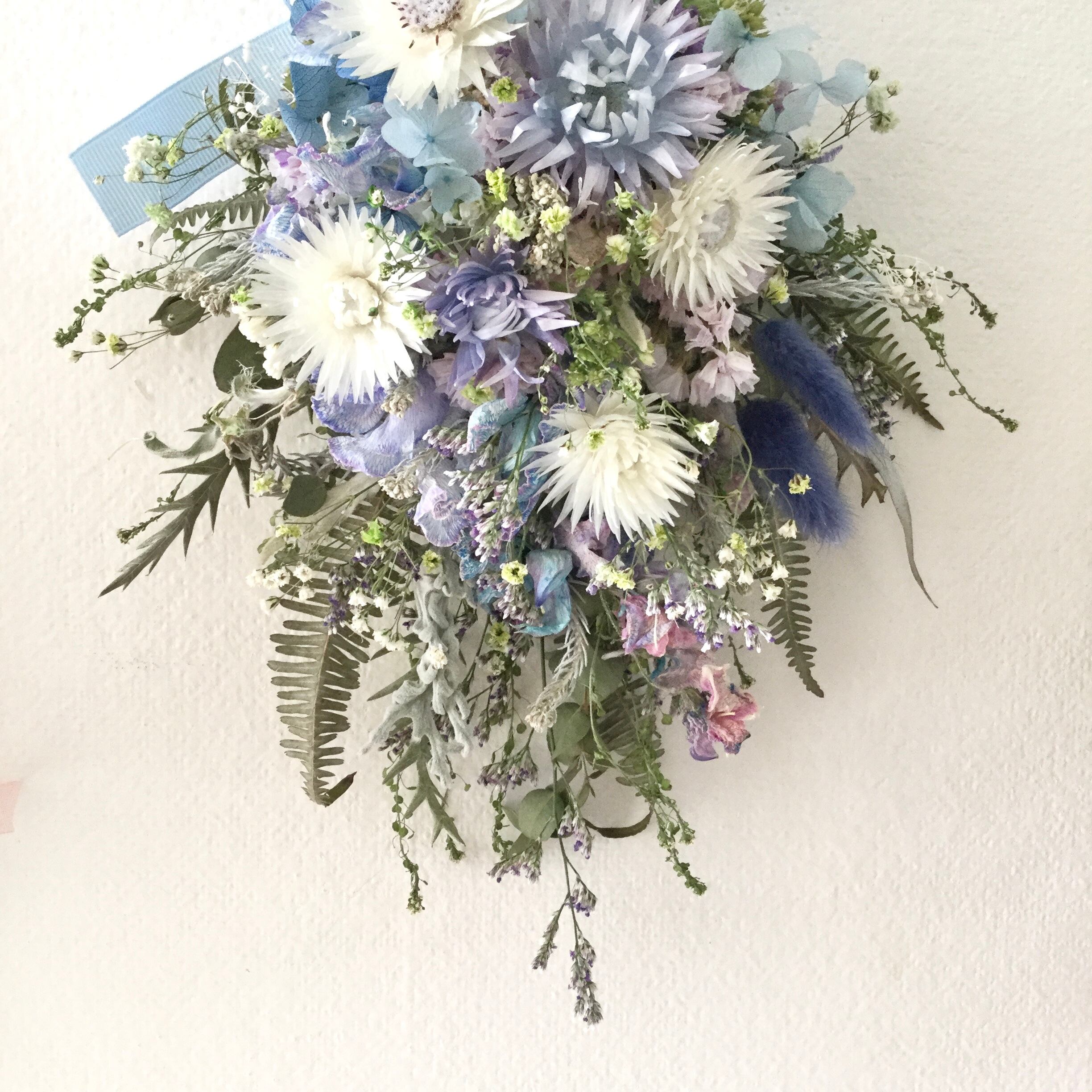 ・花材 ドライフラワー ユーカリ シルバーデージースターチス スイートピー かすみ草 ダスティーミラー ブルーファンタジア セダム ラグラス シダ アイバンホー 紫陽花 リボン等
