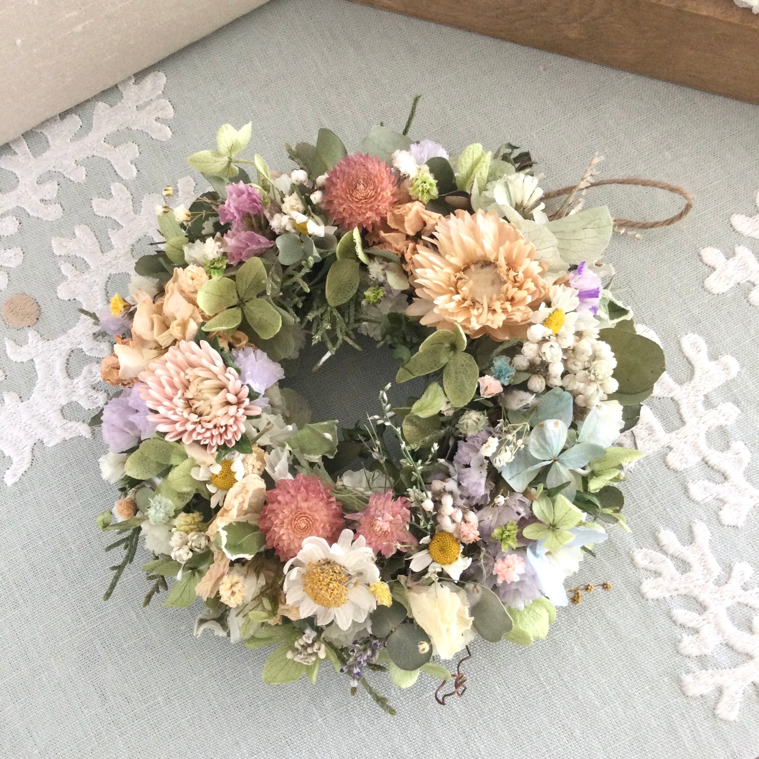 ヘリクリサム アスター 花かんざしなど小花のリースです。