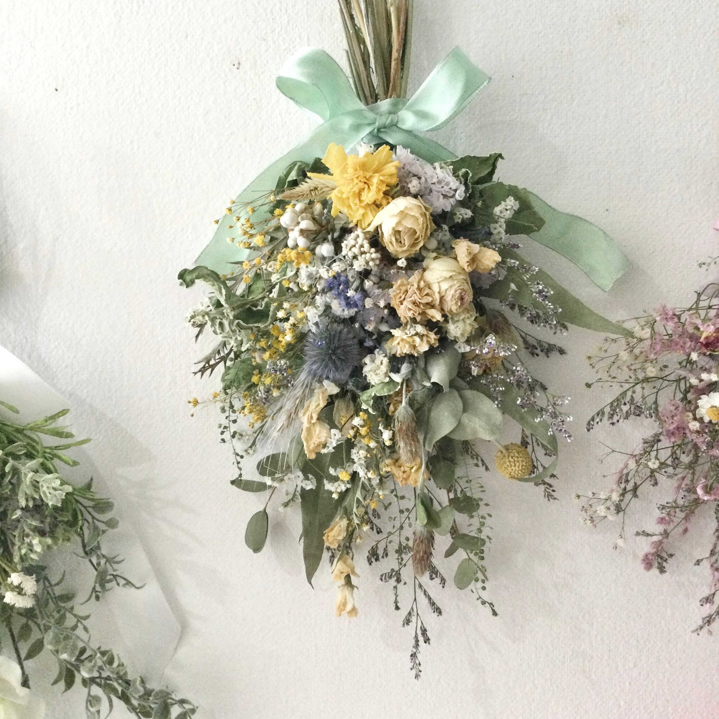 ・花材 ドライフラワー ユーカリ ローズ ラナンキュラス スイートピー スターチス かすみ草 ダスティーミラー ブルーファンタジア デルフィニウム 紫陽花 ルリ玉アザミ グラスペディア ストロベリーキャンドル ムギ アイバンホー クリスパム ナンキンハゼ オーガンジーリボン等