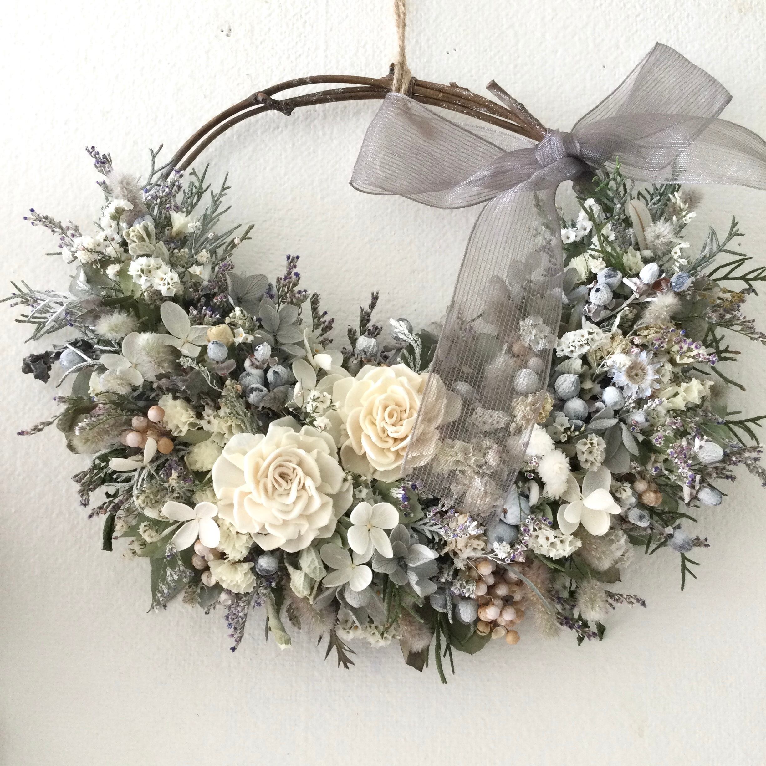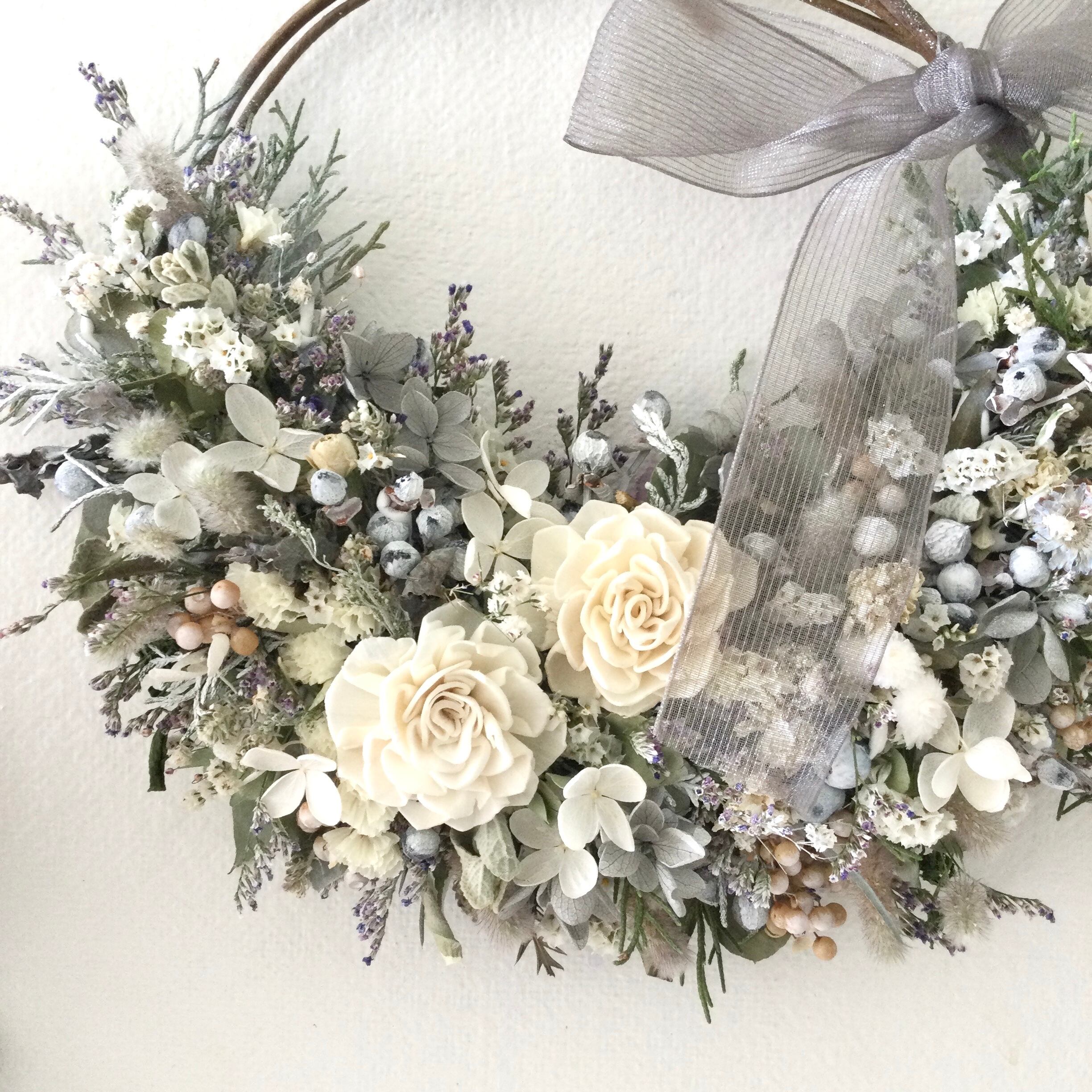 ソラダリアと小花のシャビーなリース グレイッシュ ドライフラワー 誕生日プレゼント 壁飾り 引っ越し祝い ギフト