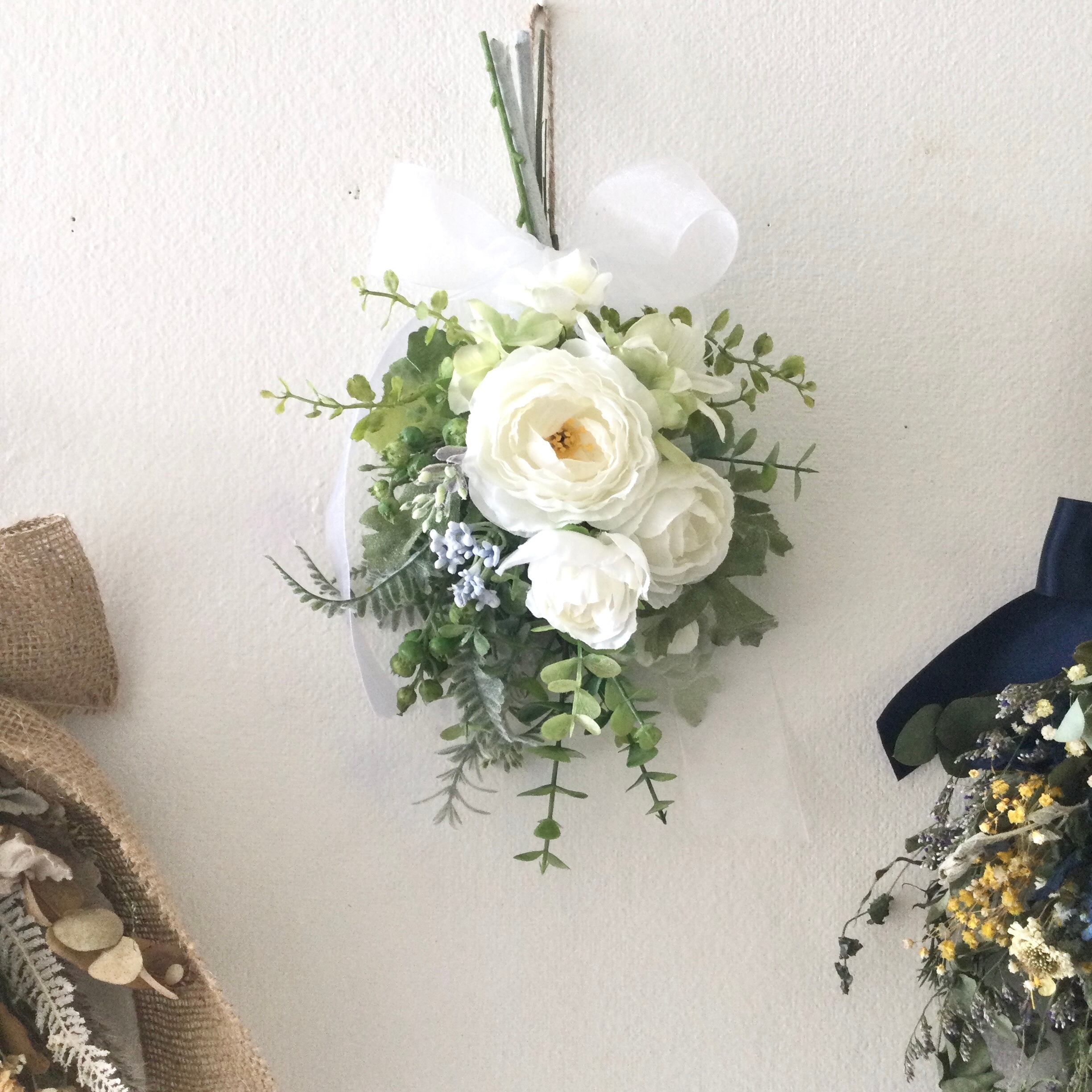 ホワイトのラナンキュラスとグリーン ナチュラルスワッグ アーティフィシャルフラワー 誕生日プレゼント 引っ越し祝い ギフト