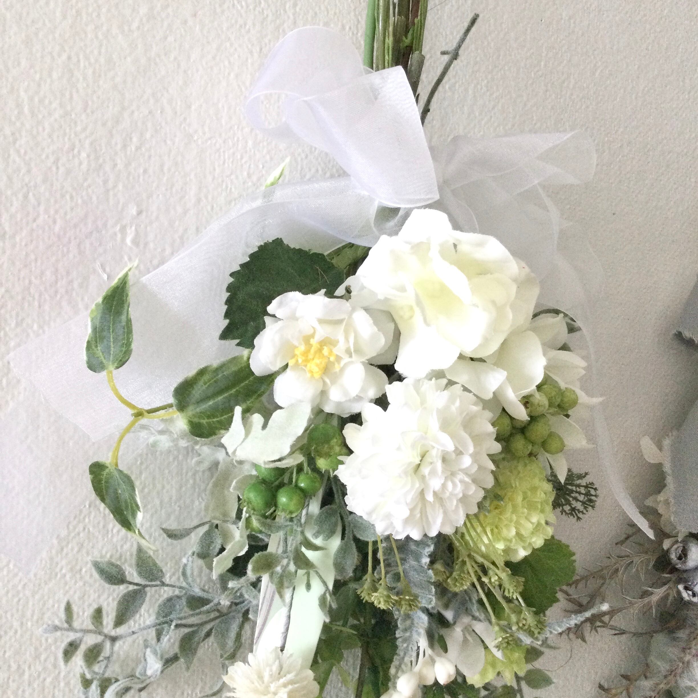 ホワイトのとグリーンのマムにユーカリなど涼しげなグリーンを合わせたスワッグです。