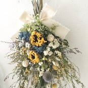 夏のミモザとひまわり 紫陽花 小花のナチュラルスワッグです。