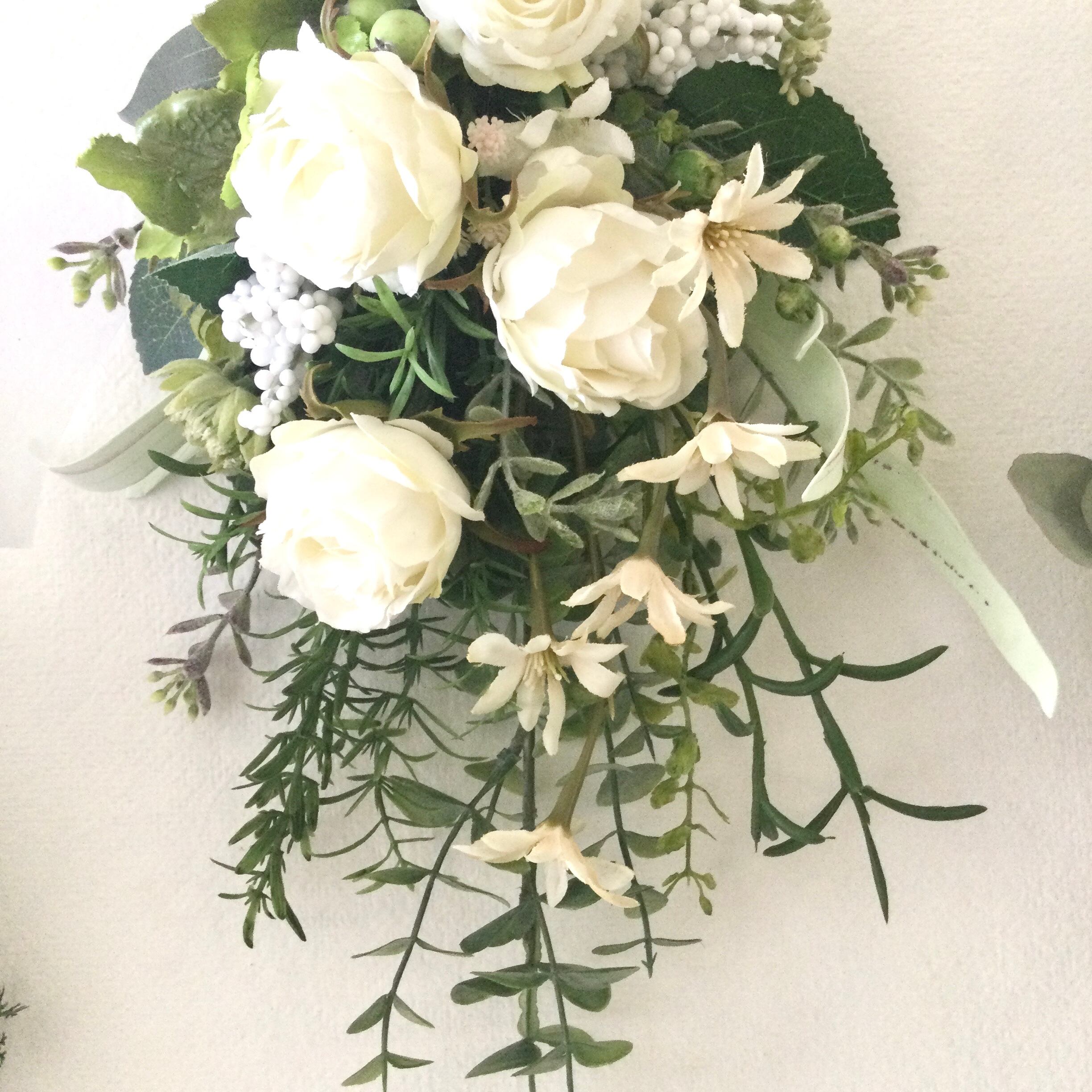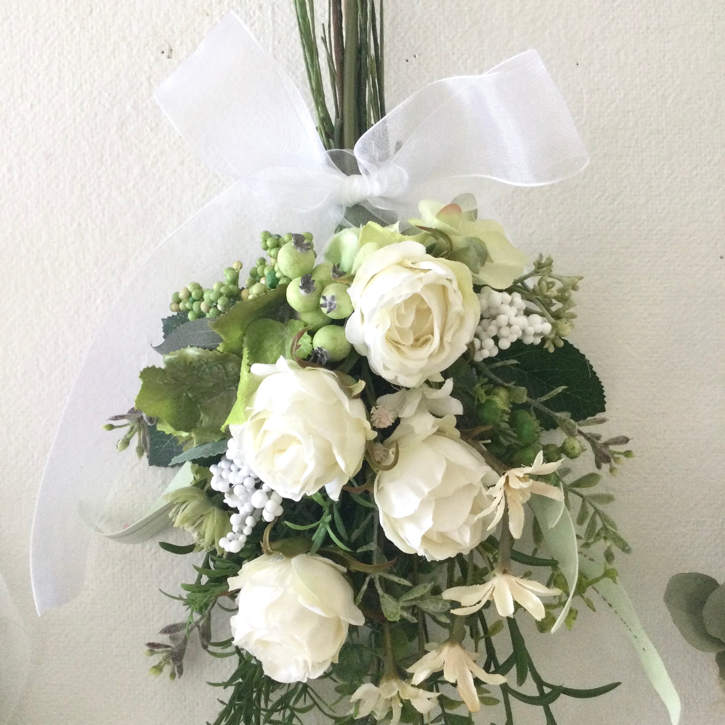 ご予約作品 ホワイトローズとグリーンのスワッグ アーティフィシャルフラワー 誕生日プレゼント 引っ越し祝い 夏 ギフト