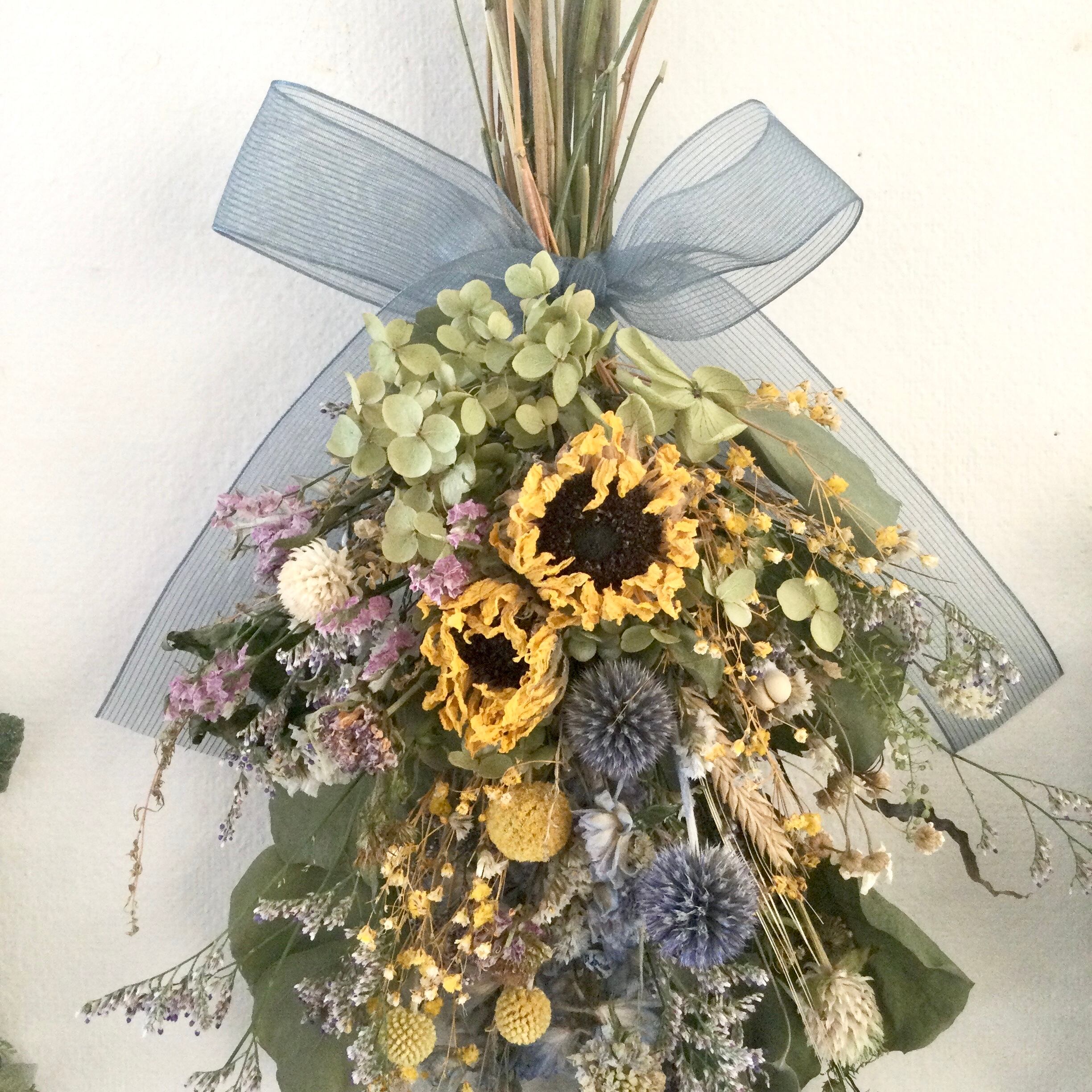 ご予約作品 ひまわりとルリ玉アザミ 小花のナチュラルスワッグ ドライフラワー 誕生日プレゼント 引っ越し祝い ギフト