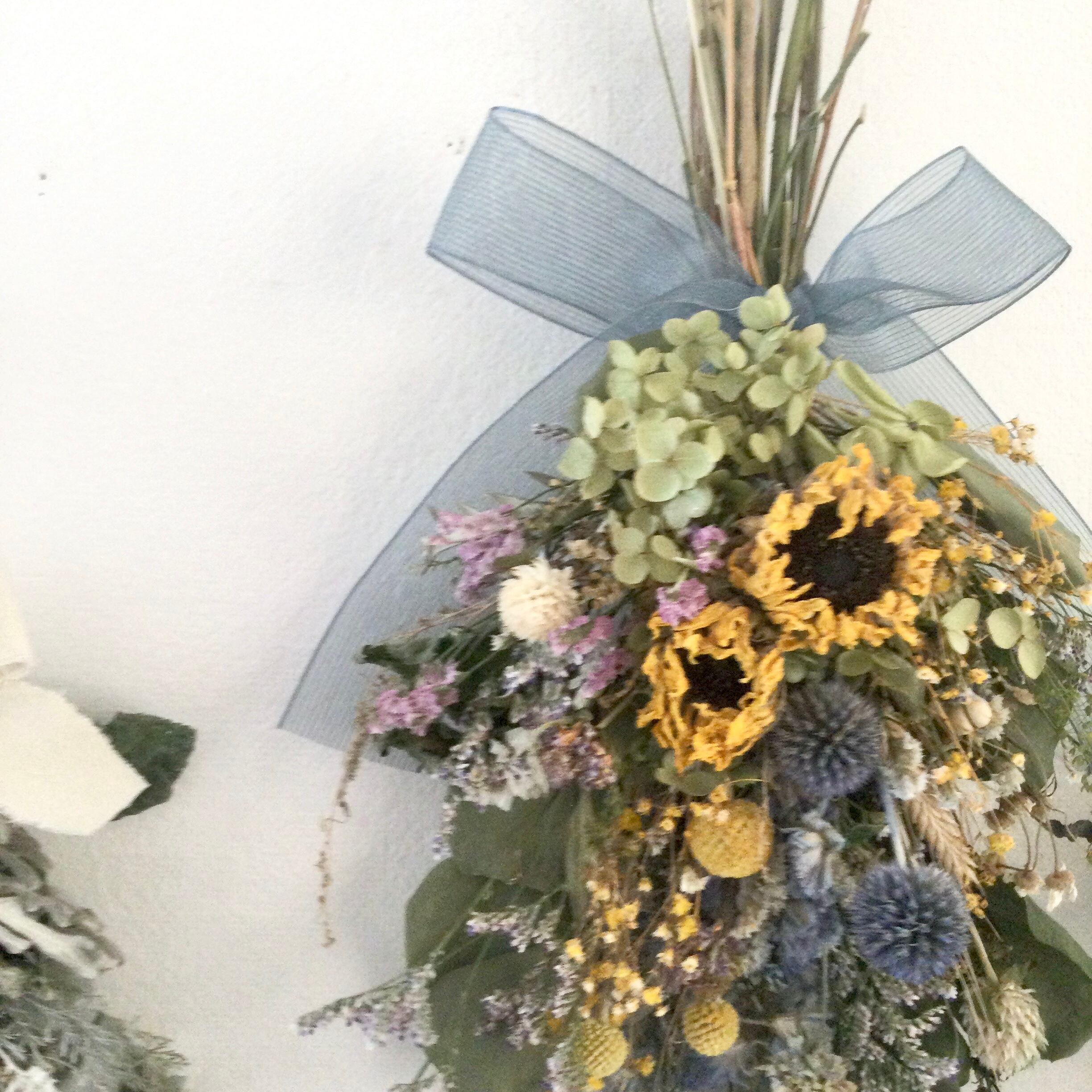 ・花材 ドライフラワー ひまわり ユーカリ スターチス HBスターチス かすみ草 ブルーファンタジア 紫陽花 グラスペディア 千日紅 瑠璃玉アザミ リーフ デルフィニウム スカビオサ マトリカリア ムギ クジャク草 アイバンホー ナズナ リボン等