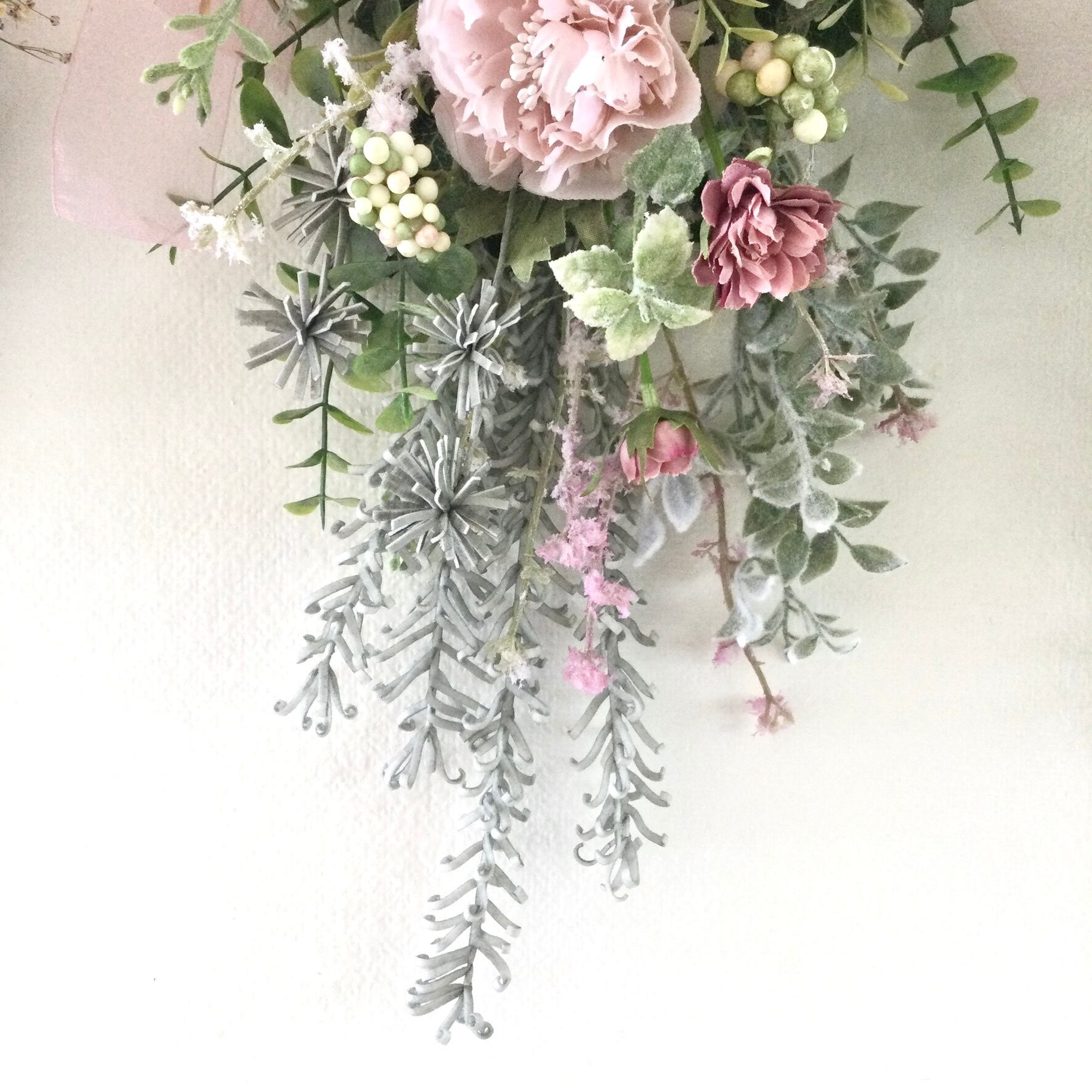 くすみピンク のピオニーにミニローズ ユーカリ グリーン 紫陽花などを合わせたスワッグです。
