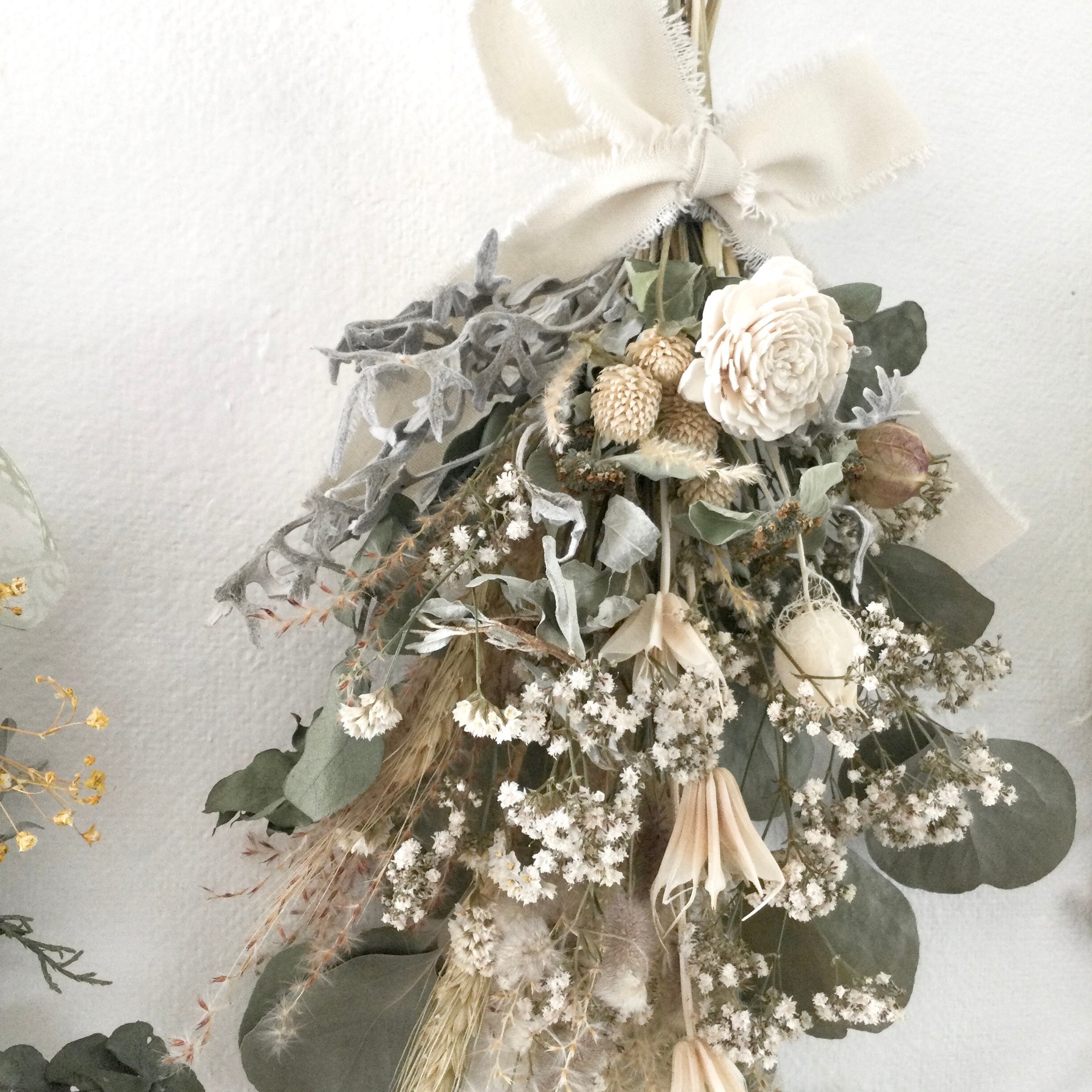 ・花材 ドライフラワー ユーカリ ソラローズ かすみ草 ダスティーミラー ラグラス 千日紅 ススキ ハハコソウ ムギ ニゲラ ニゲラオリエンタレス マウンテンミモザ リボン等