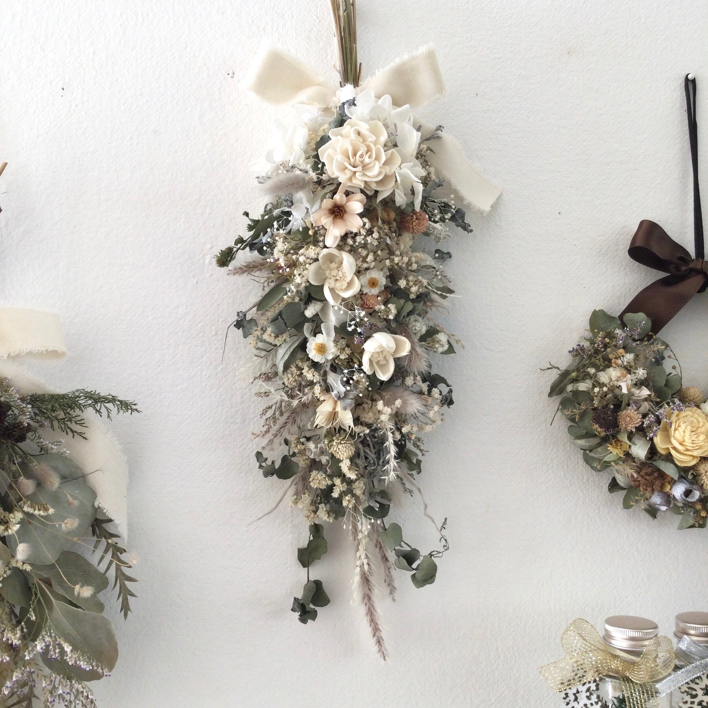 ソラダリアと小花の縦型スワッグ ナチュラルホワイト ドライフラワー 誕生日プレゼント 引っ越し祝い 秋 ギフト