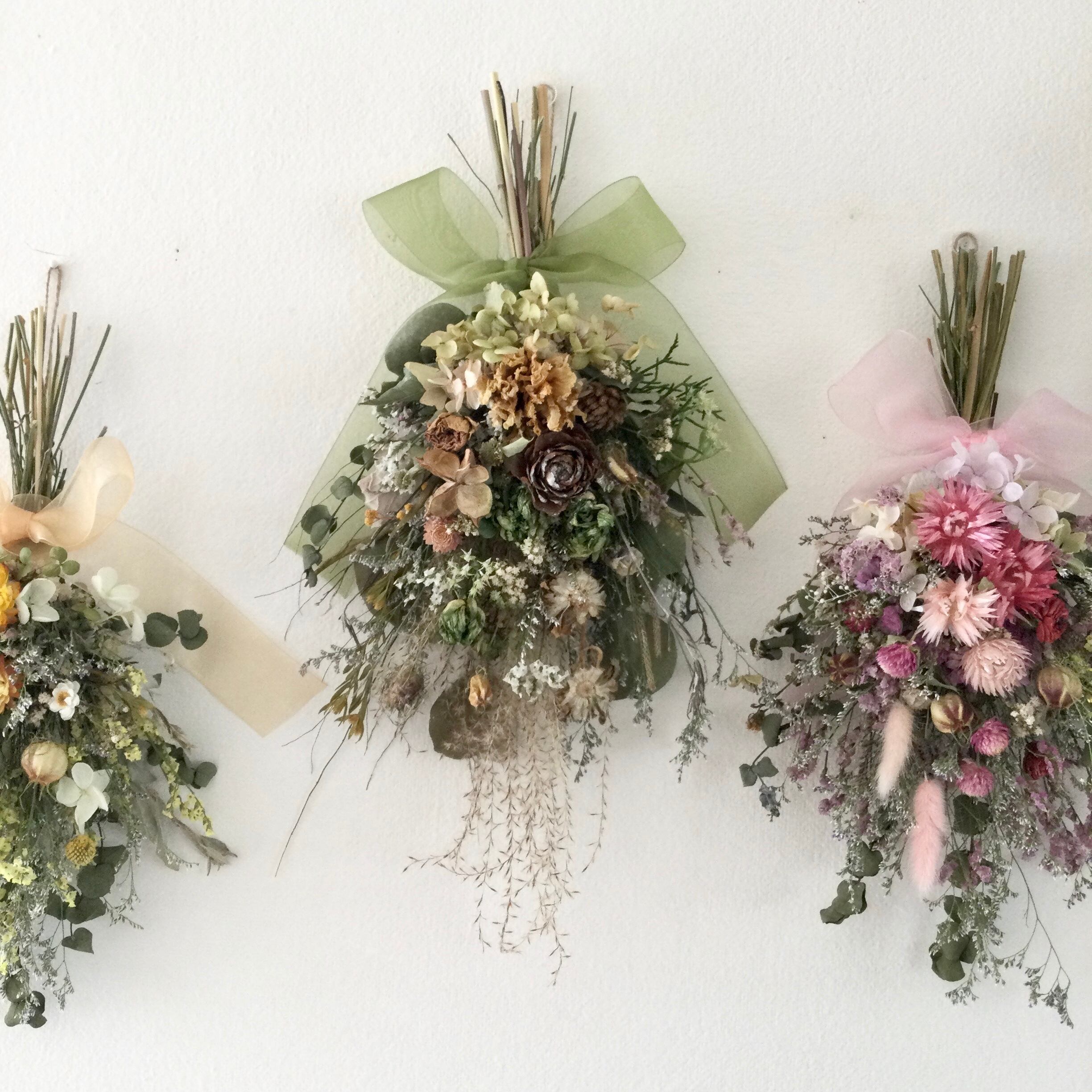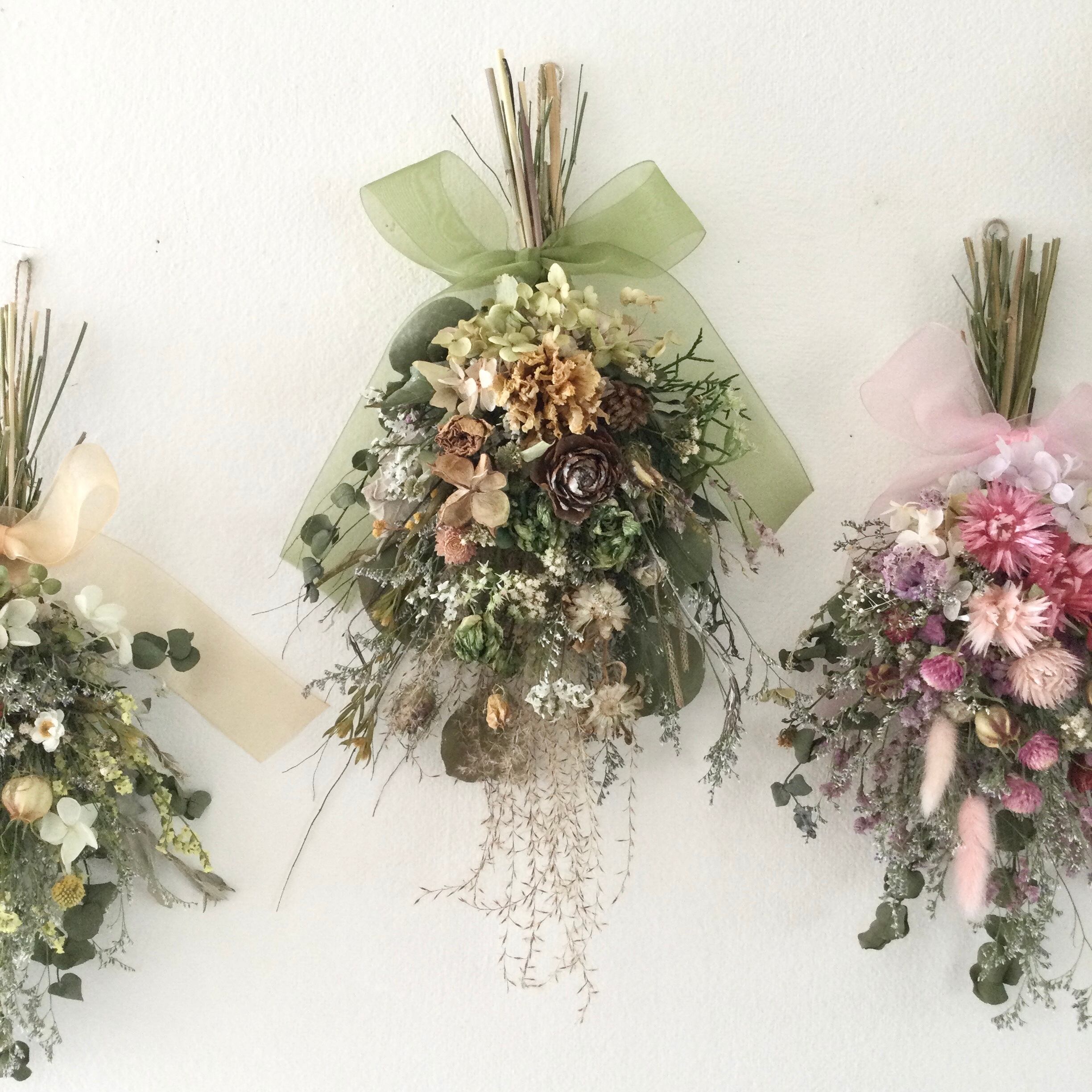 ・花材 ドライフラワー ユーカリ 木の実 スターチス かすみ草 ブルーファンタジア 紫陽花 ダスティミラー 千日紅 ニゲラ ローズ オリエンタルローズ ラグラス マウンテンミント アカシア ススキ トルコキキョウ アスター シダローズ アイスブルー リボン等