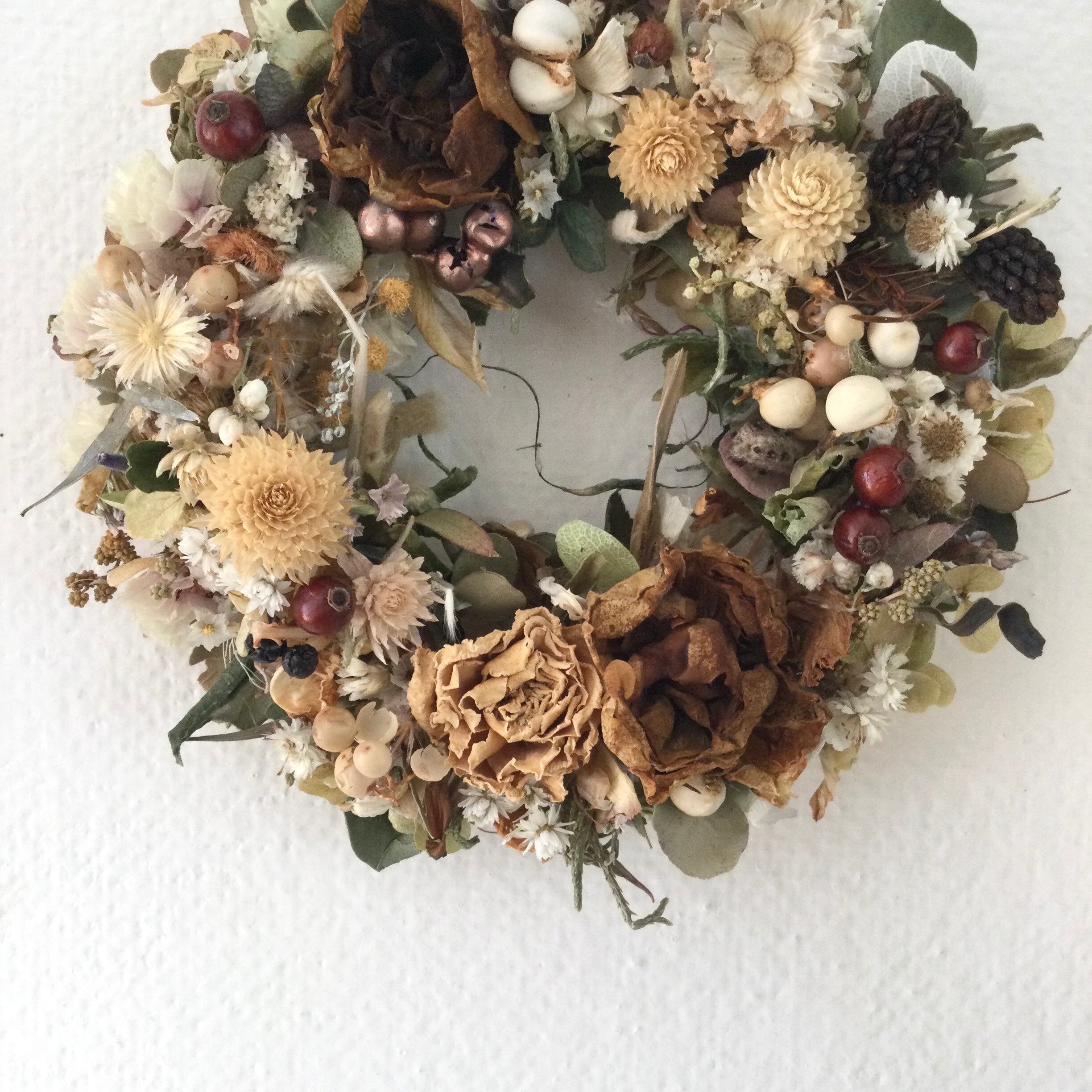 アンティークカラーのローズが可愛い大人カラーのリースです。