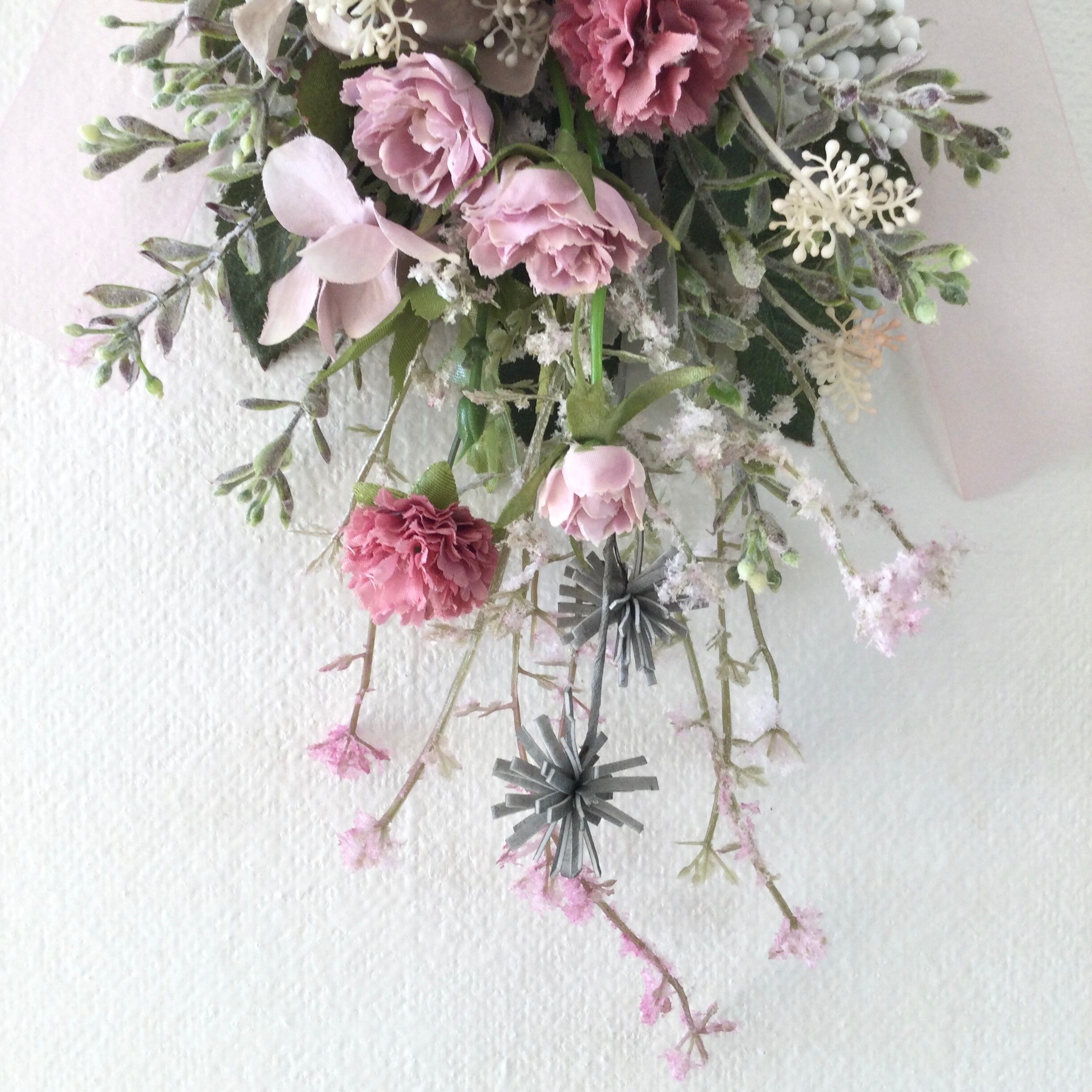 ピンクのローズと小花 紫陽花などを合わせたスワッグです。