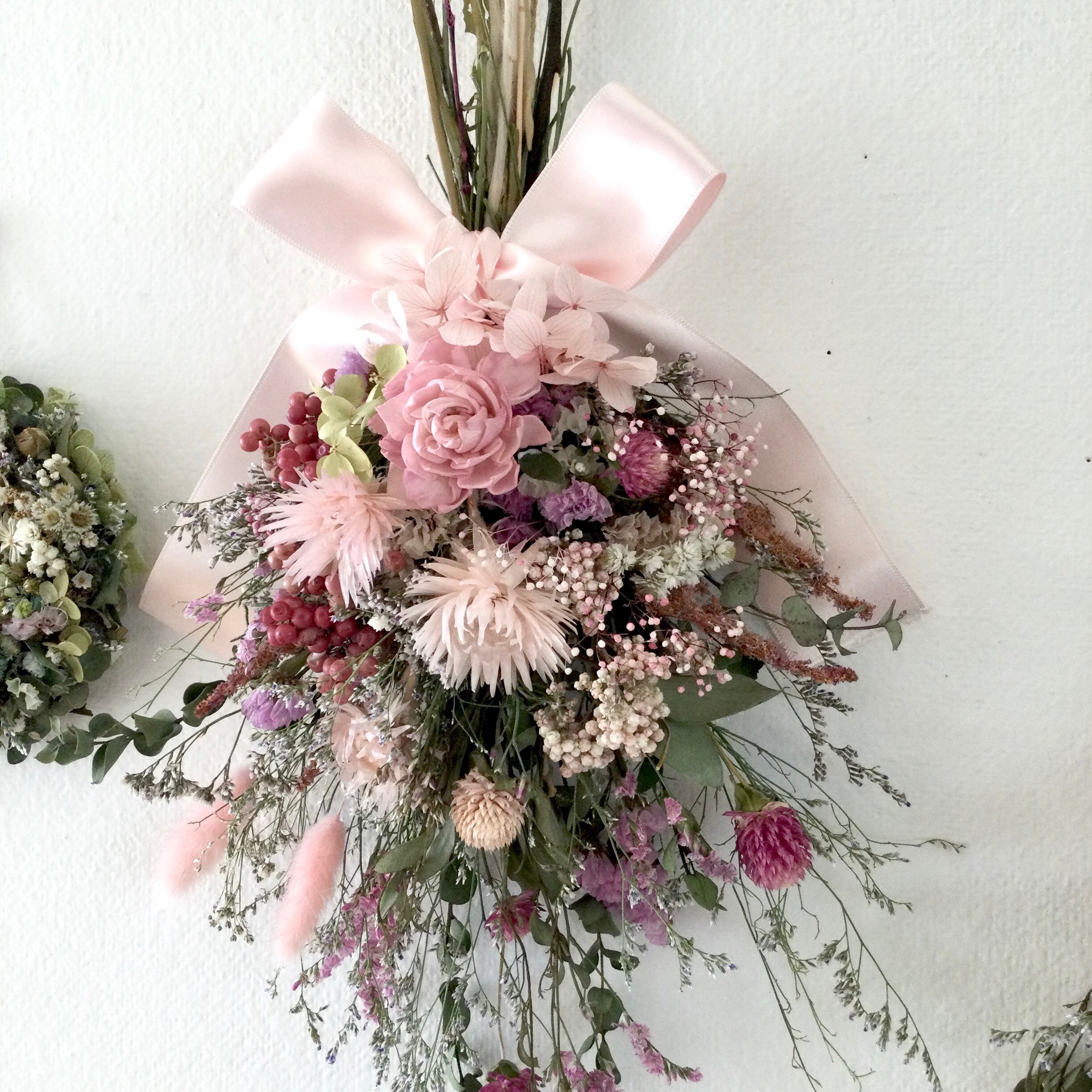 シルバーデージー ソラダリア 千日紅 ラグラスペッパーベリー などピンクのお花とユーカリグリーンなどををまとめて優しい雰囲気になりました。