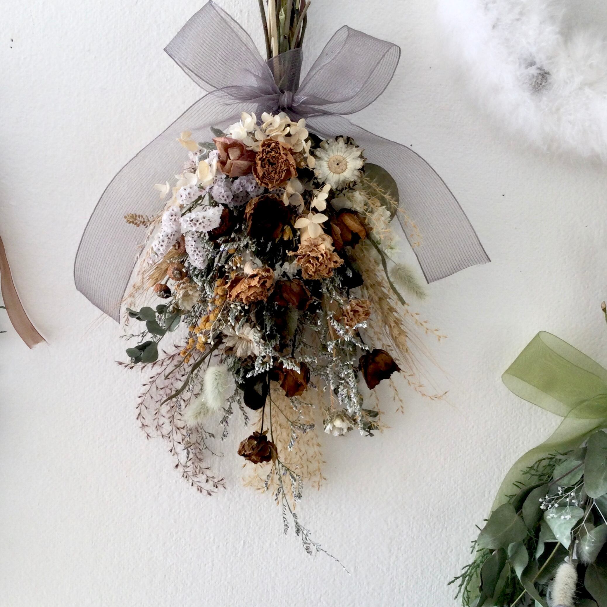 ユーカリ ローズ カーネーション 小花などアンティークカラーのお花をふんわり合わせたスワッグです。