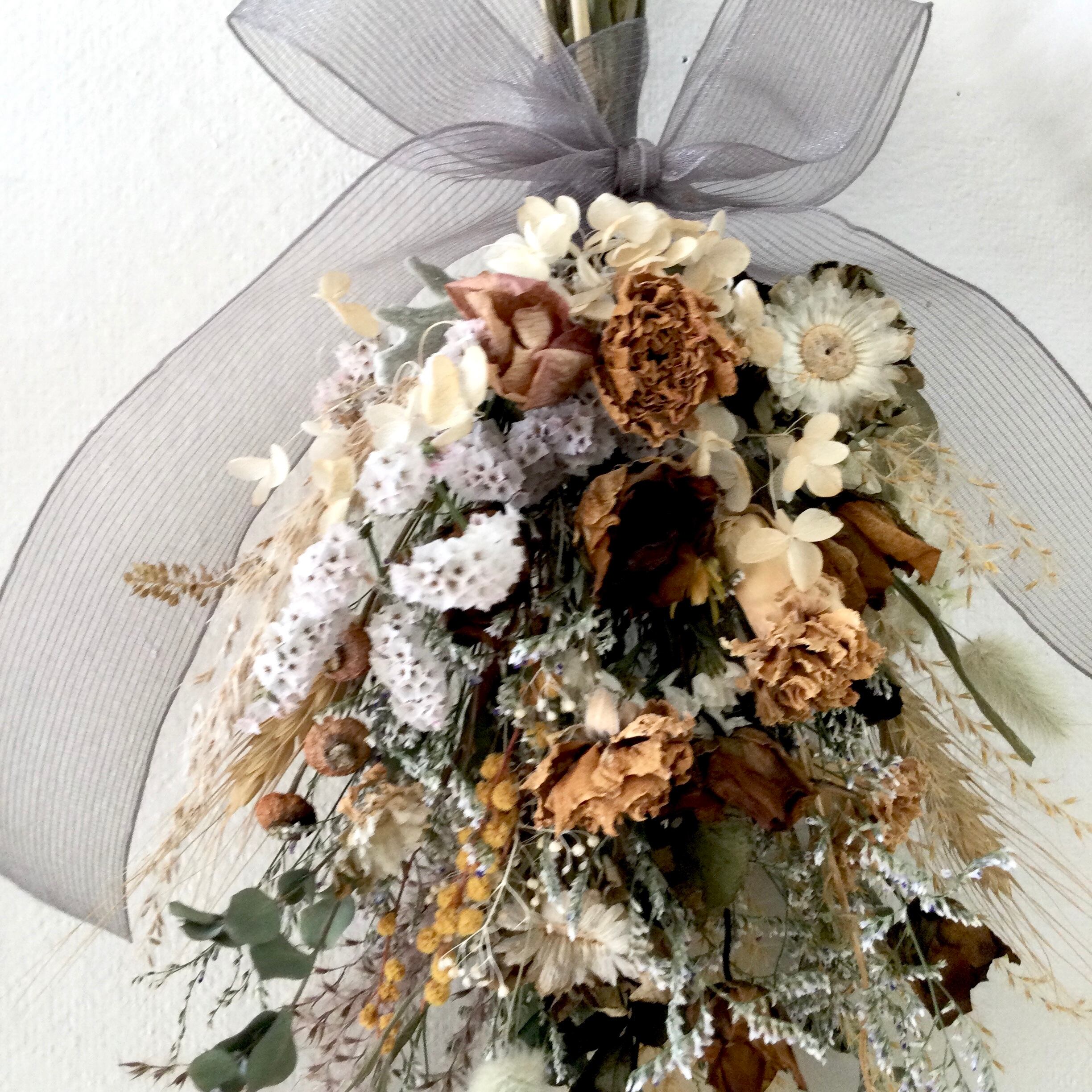 アンティークカラー ローズとカーネーション 小花のナチュラルスワッグ ドライフラワー 誕生日プレゼント 引っ越し祝い クリスマス ギフト