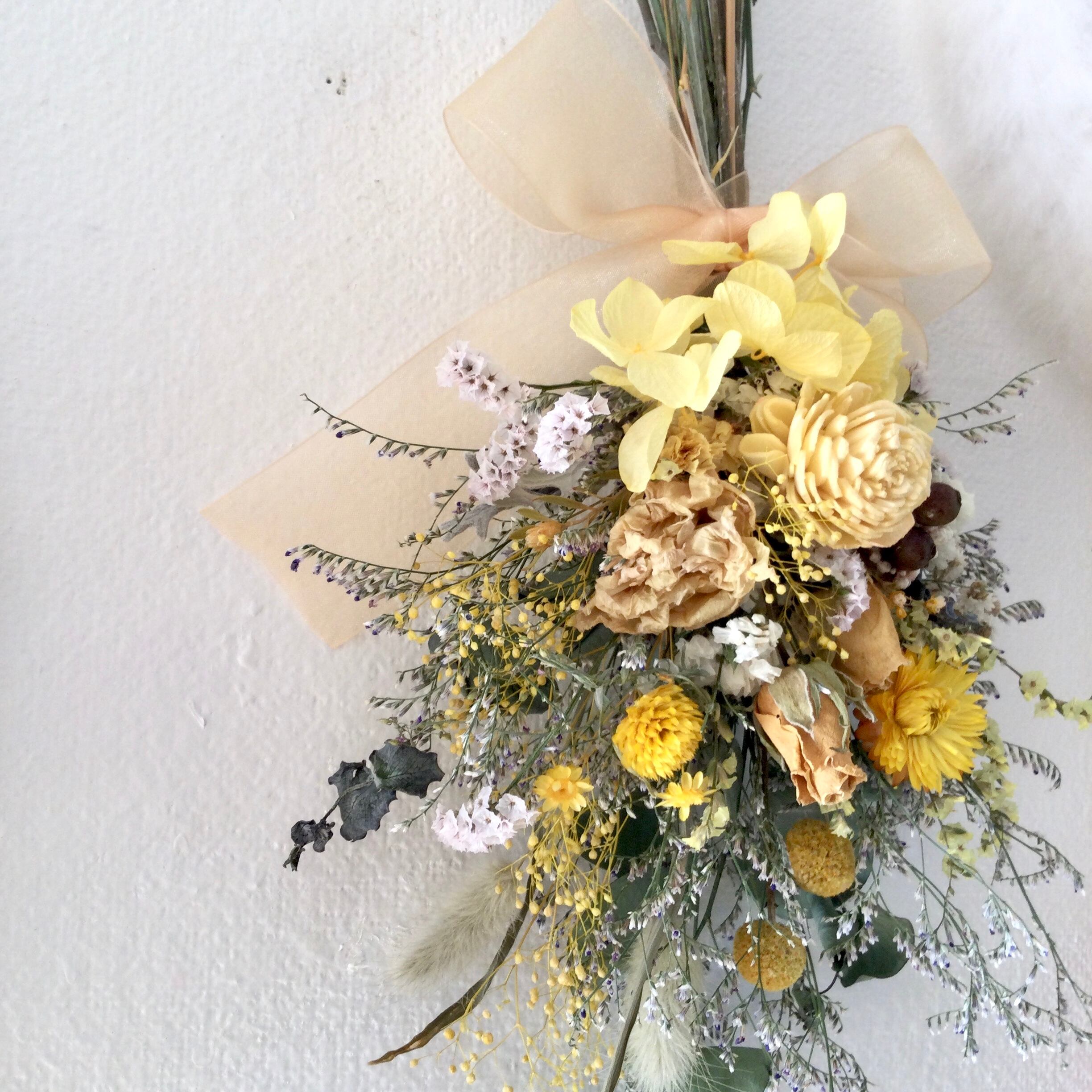 イエローのお花とユーカリなどグリーンをふんわりまとめました。
