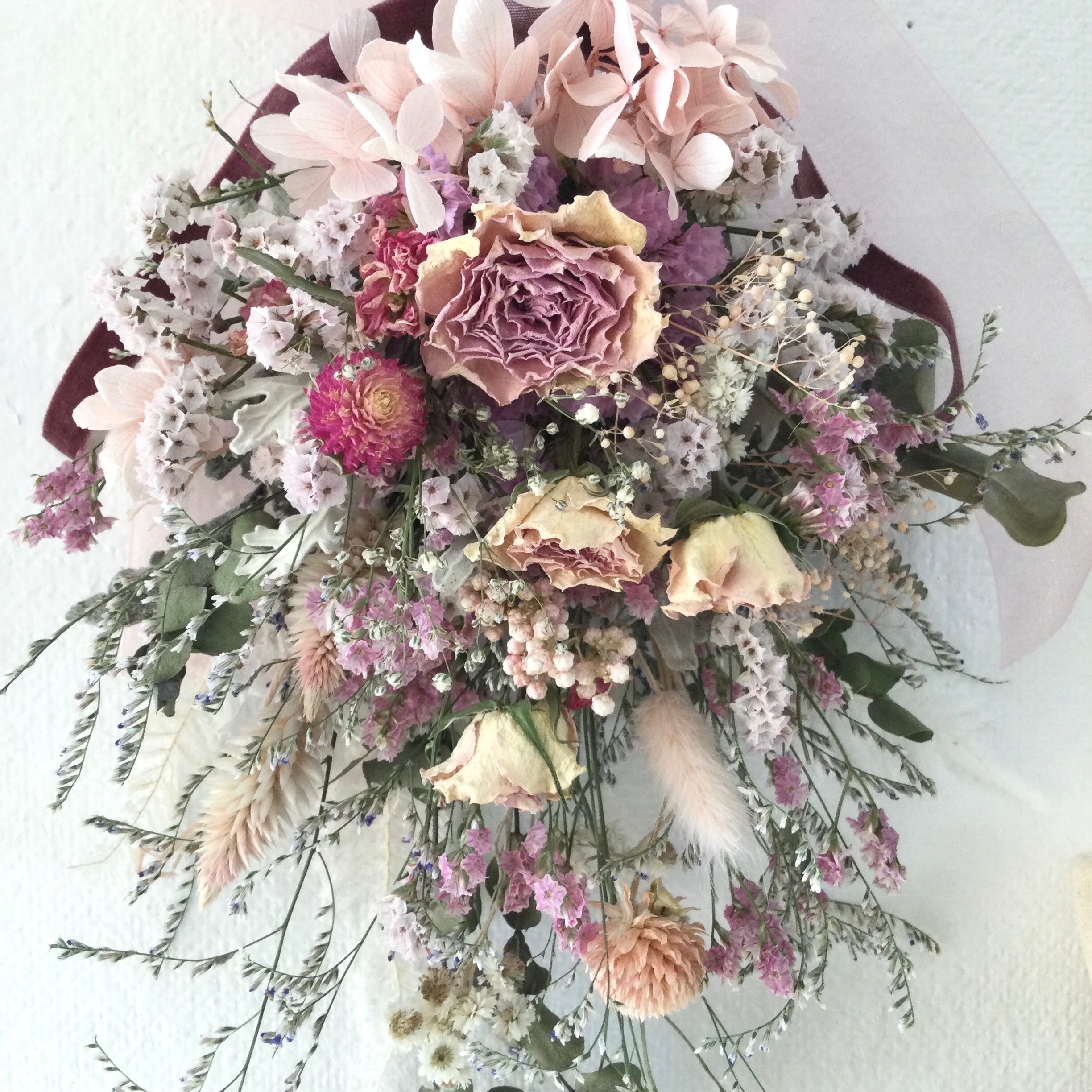 ・花材 ユーカリ ローズ ラグラス スターチス ケイトウ HBスターチス かすみ草 ブルーファンタジア 紫陽花 ライスフラワー シダ 千日紅 ダスティミラー ハハコソウ リボン等