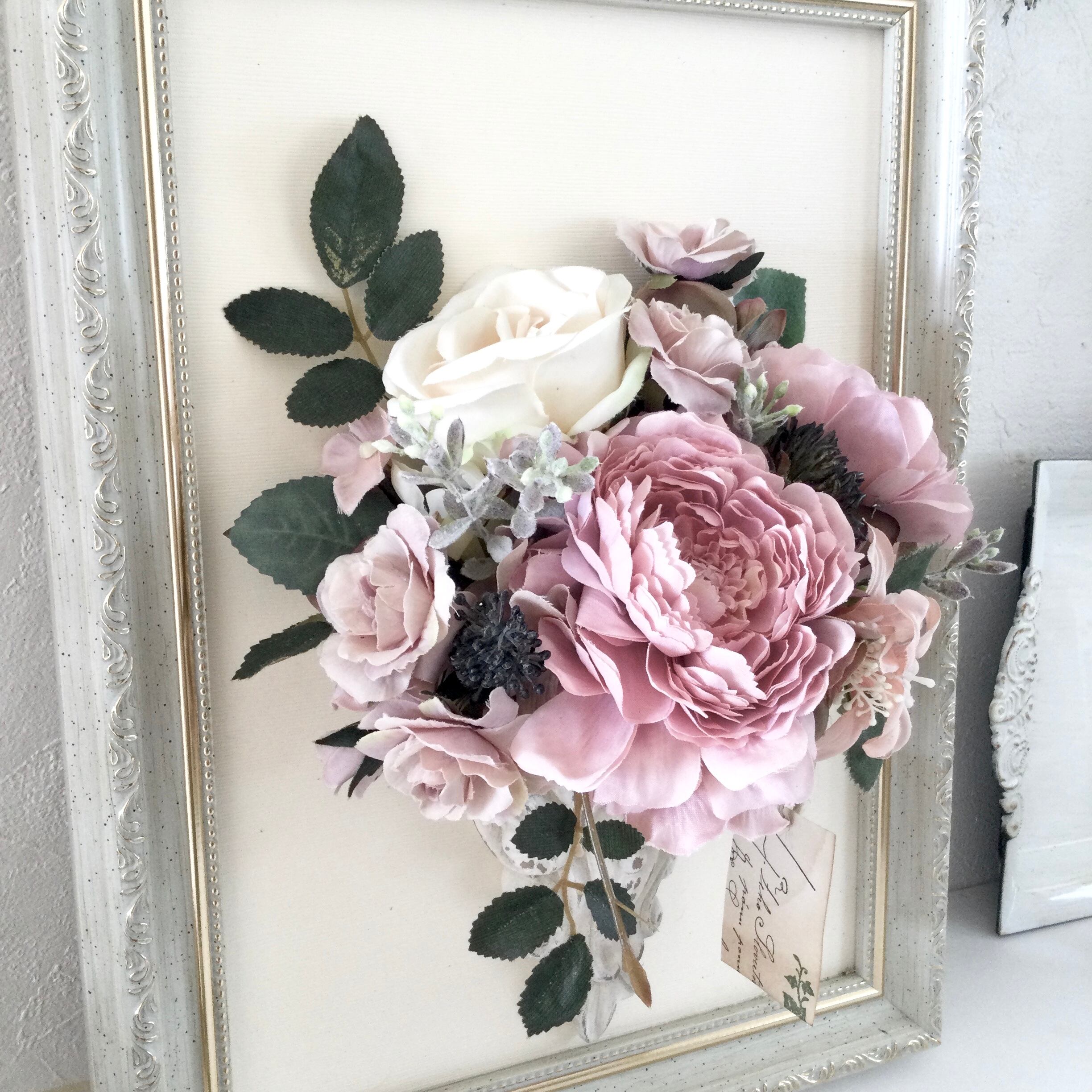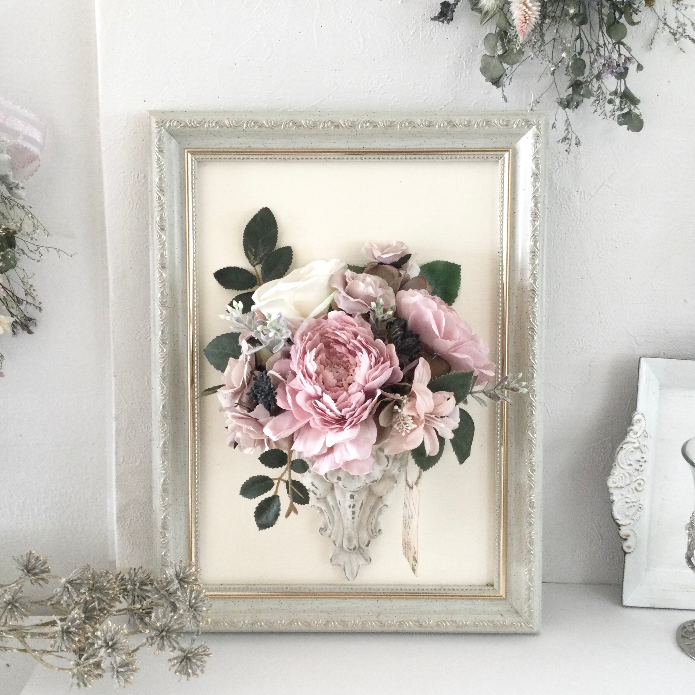壁掛けフレームにふんわり優しいピンクのお花をアンティーク調の花器にアレンジしました。