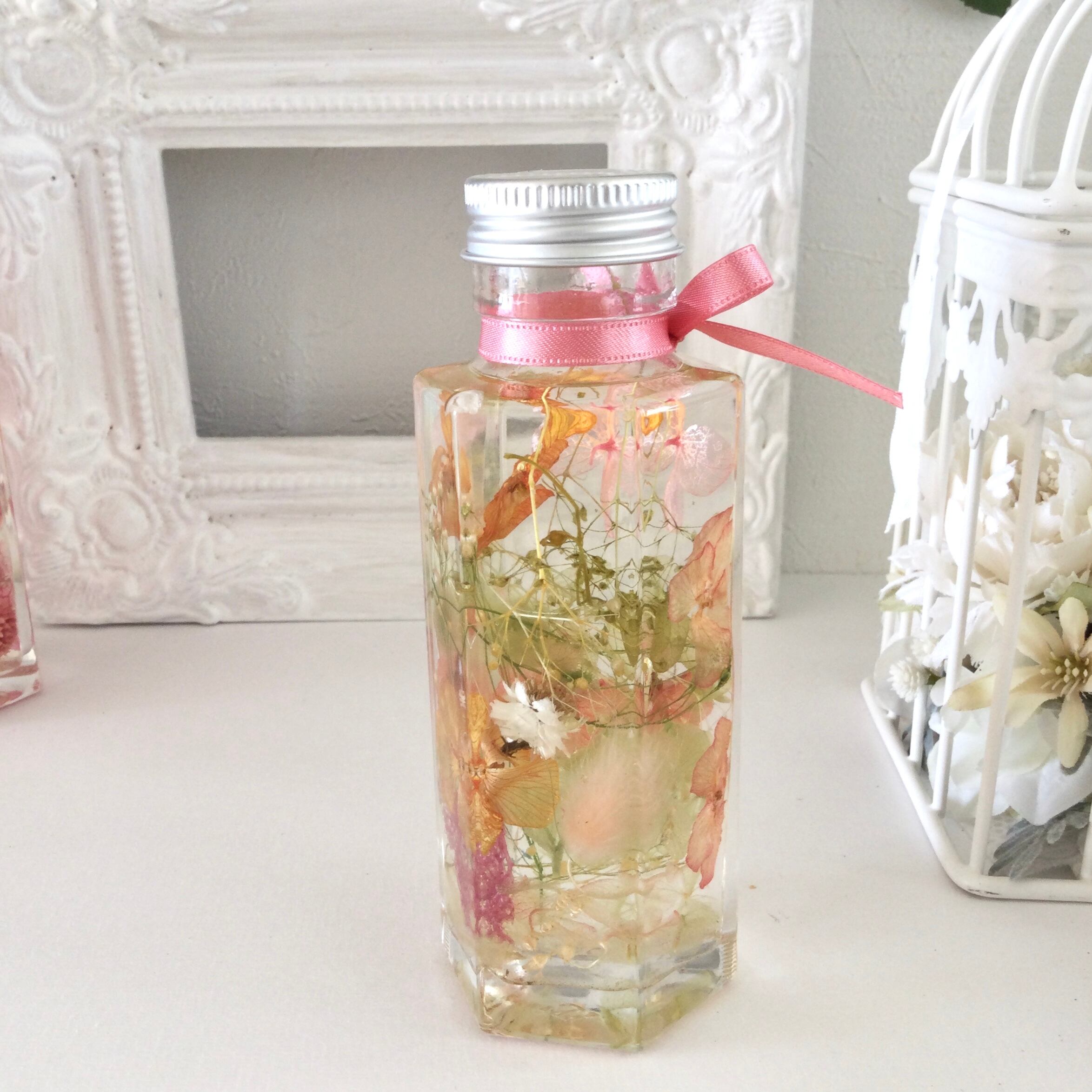 お花はオイルの中に浮いている状態ですので、配送時の状況によりお花の位置が動いて変わってしまう場合があります。