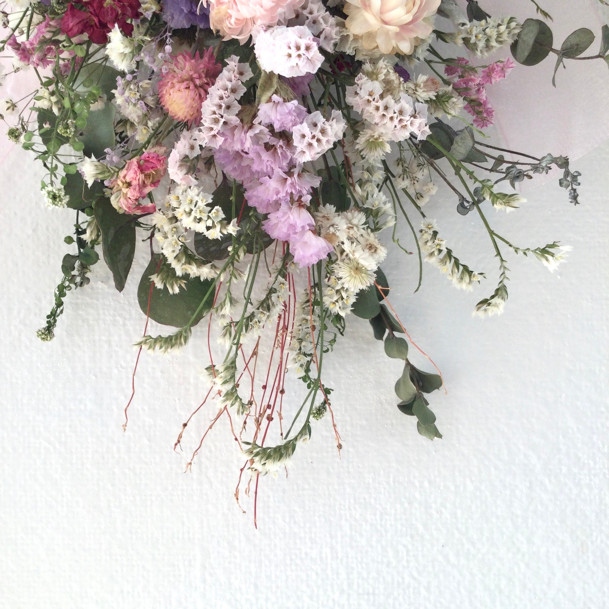 ・花材 ユーカリ ヘリクリサム スターチス HBスターチス かすみ草 ブルーファンタジア デルフィニウム 紫陽花 千日紅 サクラソウ ハハコソウ リボン等