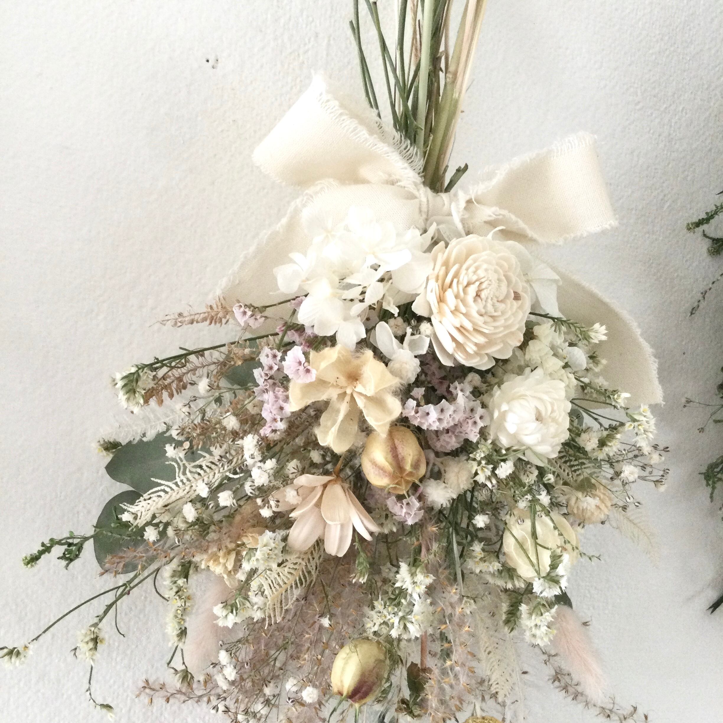 ふわふわススキ フヨウ プチフラワー ヘリクリサム ニゲラなど可愛いお花と小花のナチュラルスワッグです。