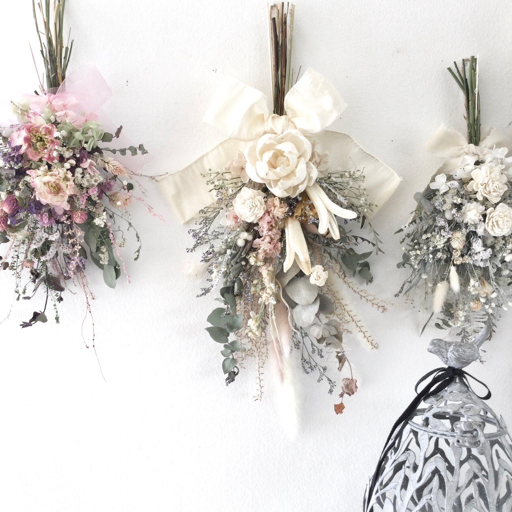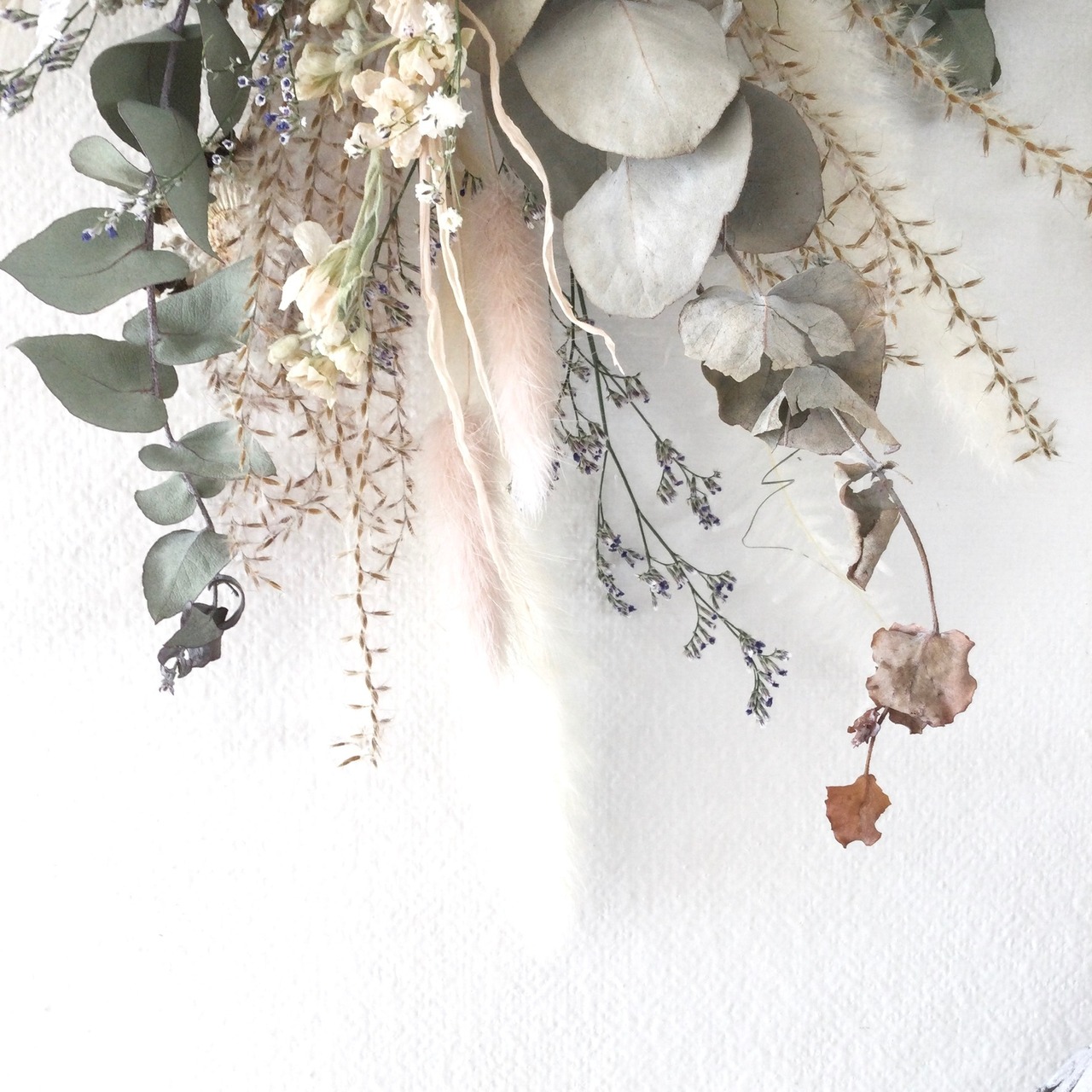 ・花材 ドライフラワー ソラピオニー ソラローズ ユーカリ スターチス かすみ草 ブルーファンタジア 紫陽花 ダスティミラー ススキ アスター ナズナ ハハコソウ リーフ ブルニア ラグラス テールリード チガヤ デルフィニウム イモーテル シダ リボン等