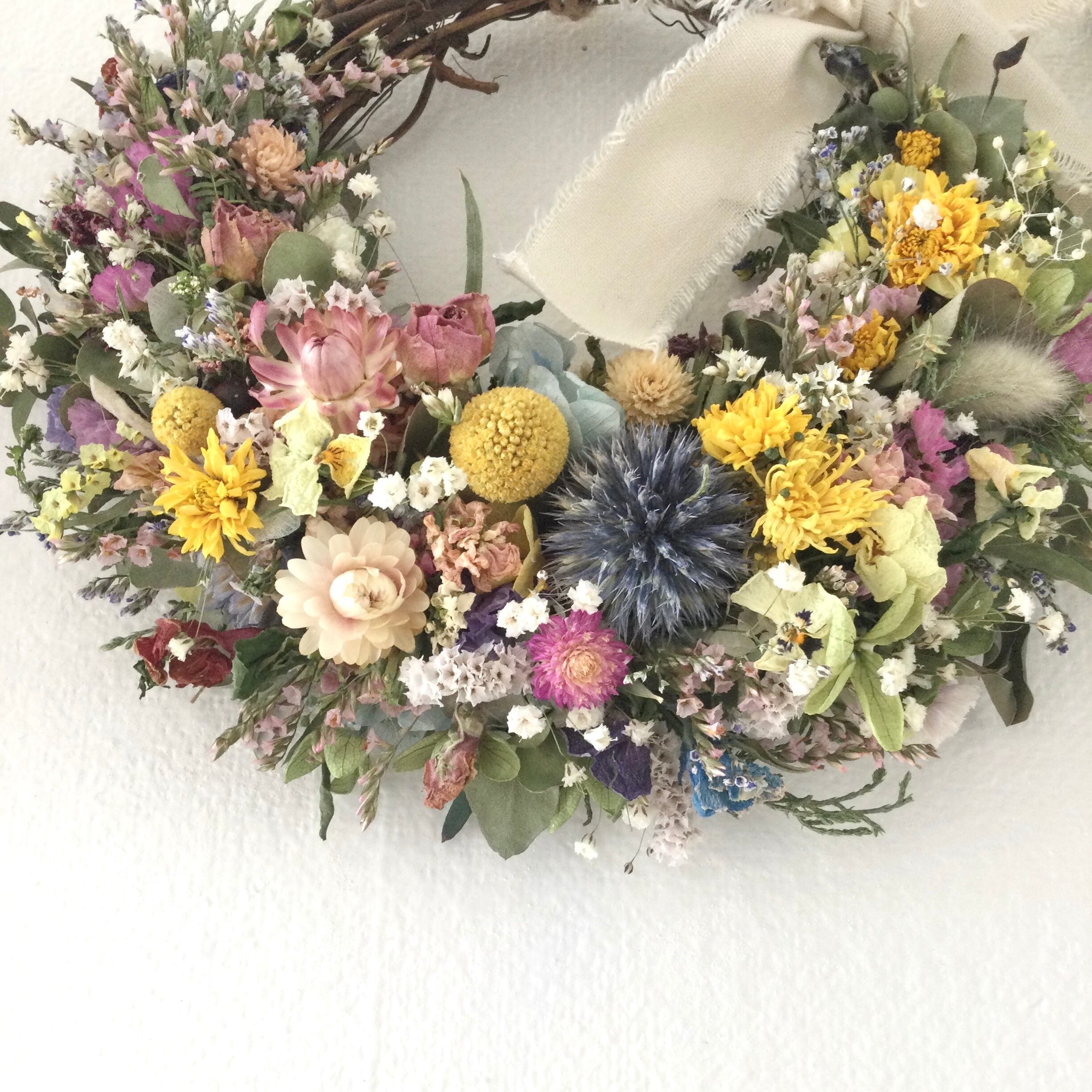 ・花材 ローズ ヘリクリサム ユーカリ かすみ草 ビオラ デルフィニウム ハハコソウ スターチス ナズナ 千日紅 グラスペディア 瑠璃玉アザミ マム ラグラス 紫陽花 グリーン リボン等