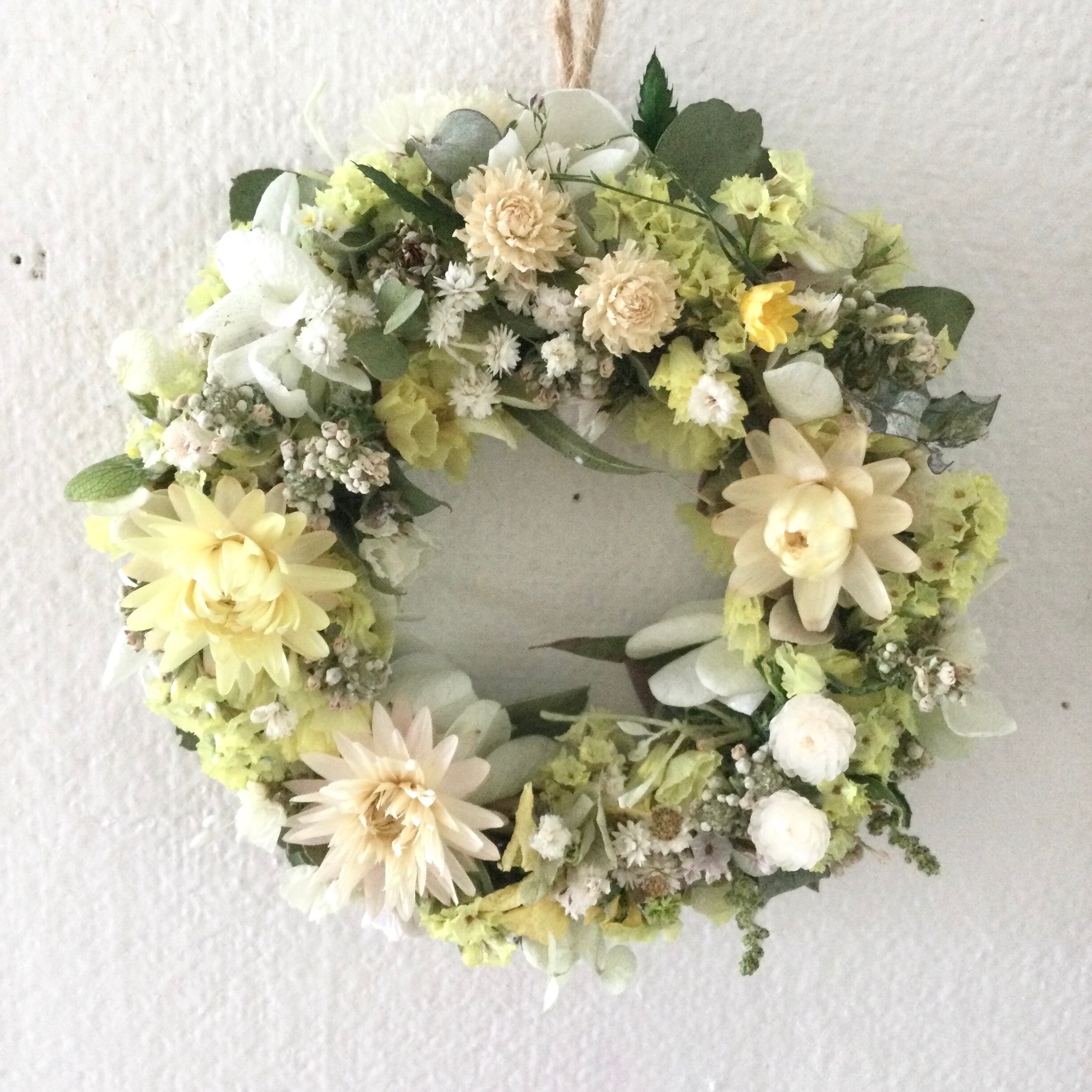 ヘリクリサム スターチス 千日紅など薄色 レモンイエローの小花のミニリースです。