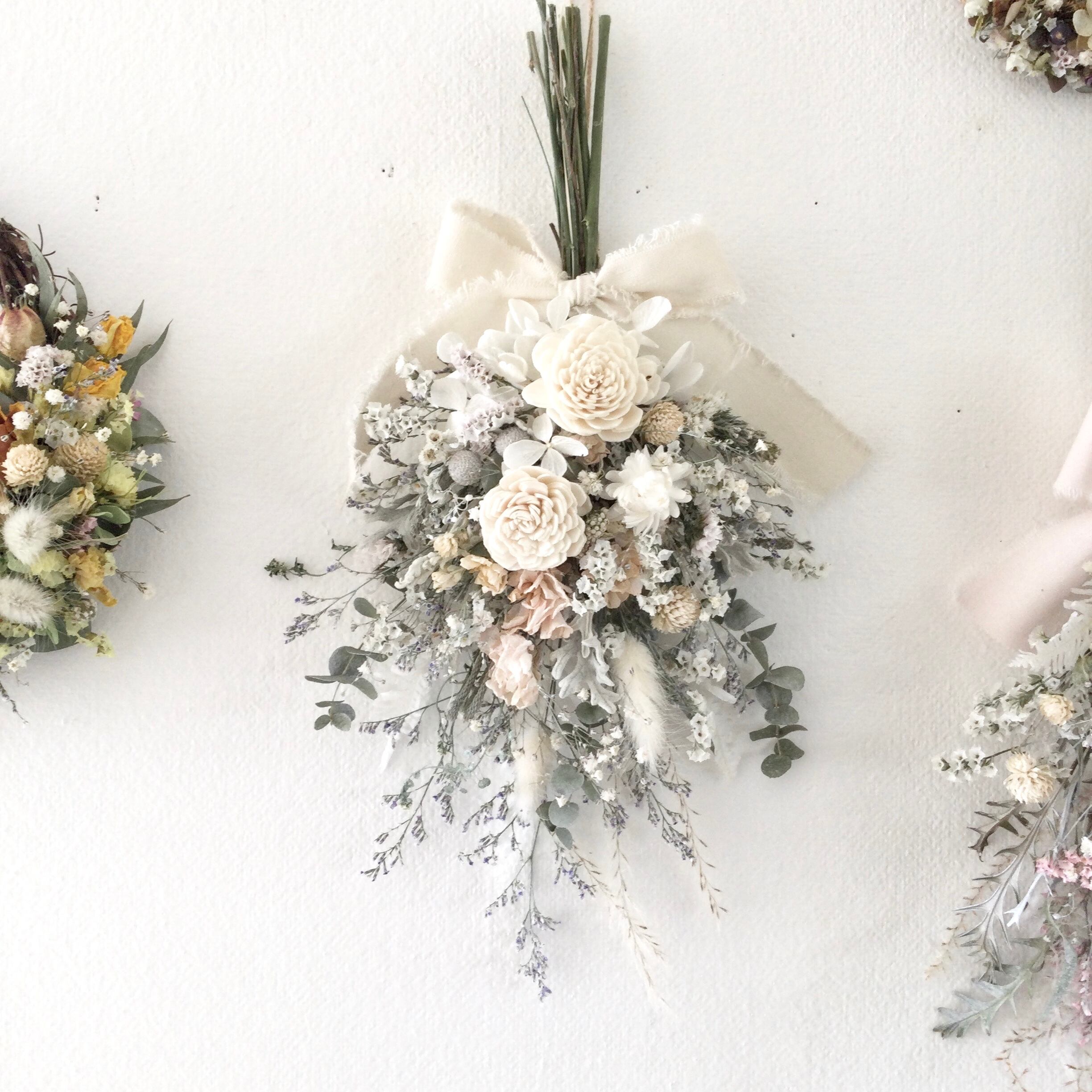 ・花材 ドライフラワー ユーカリ ソラローズ 紫陽花 スターチス リーフ かすみ草 ブルーファンタジア 千日紅 シダ ハハコソウ ススキ ラグラス シャリンパイ ヘリクリサム アスター デルフィニウム リーフ ブルニア リボン等