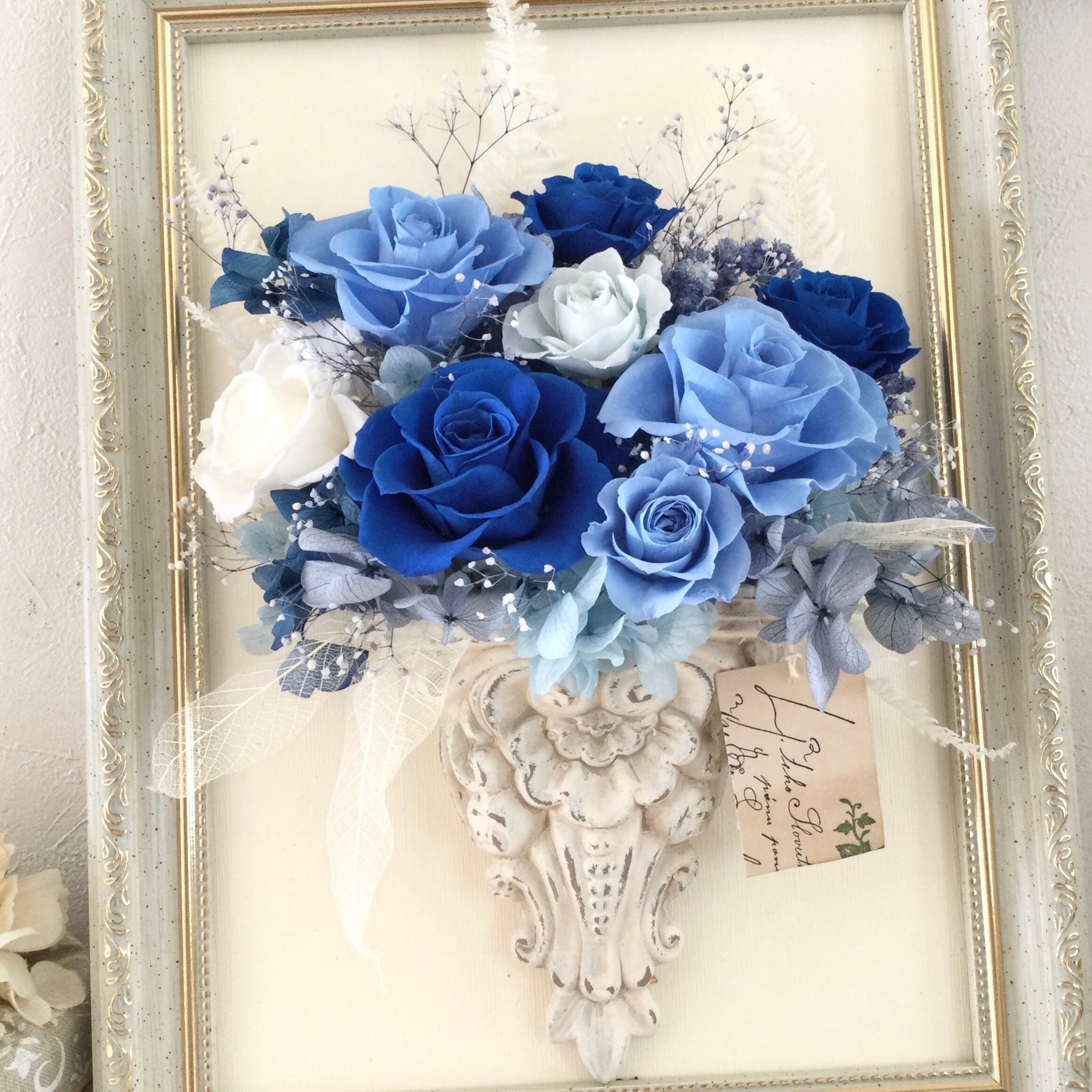 壁掛けフレームにブルーのローズをアンティーク調の花器にアレンジしました。