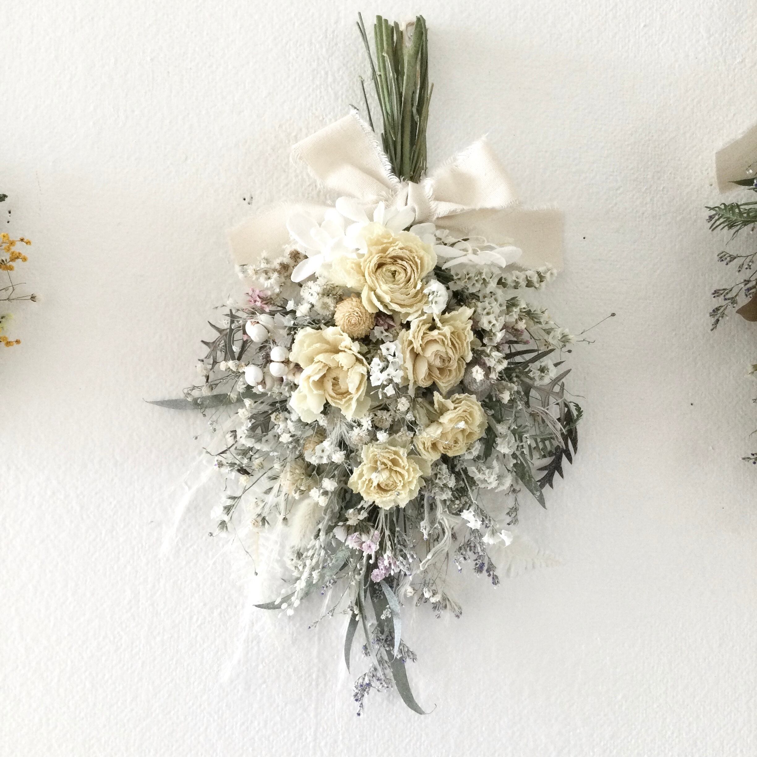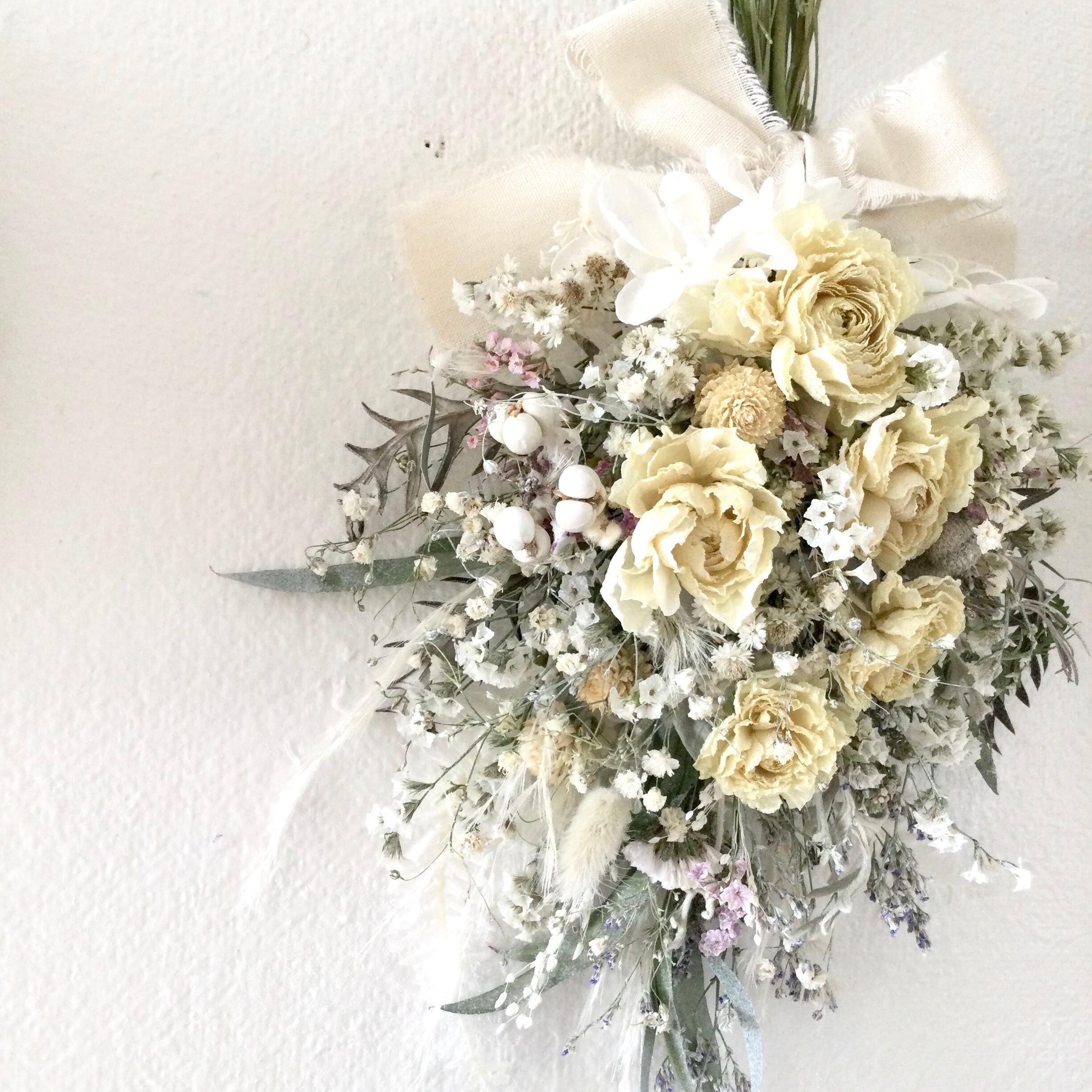 ラナンキュラスと小花のスワッグ ナチュラルホワイト ドライフラワー 誕生日プレゼント 引っ越し祝い 記念日 ギフト