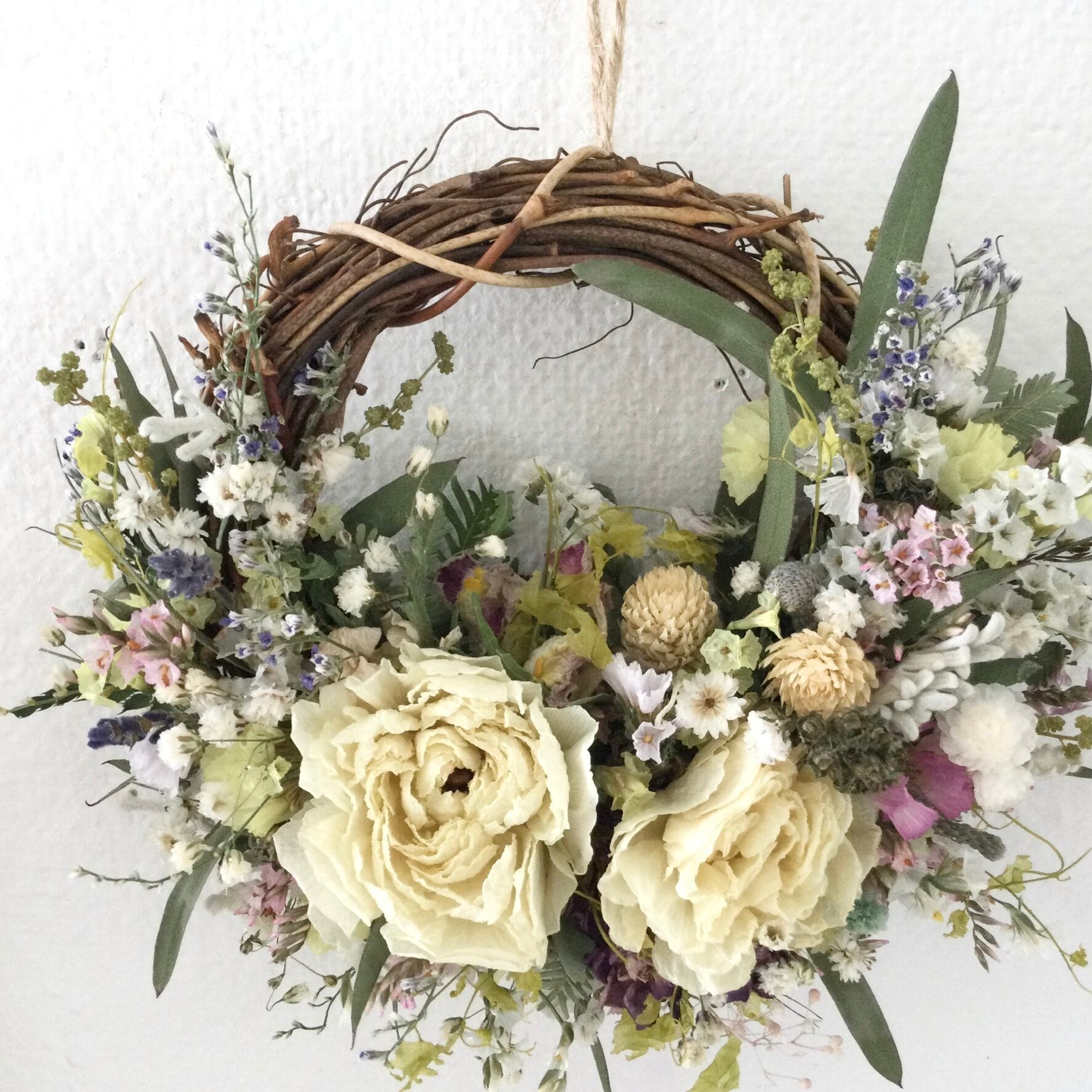 ホワイトのラナンキュラスにユーカリ スターチス 千日紅など小花を合わせたミニリースです。