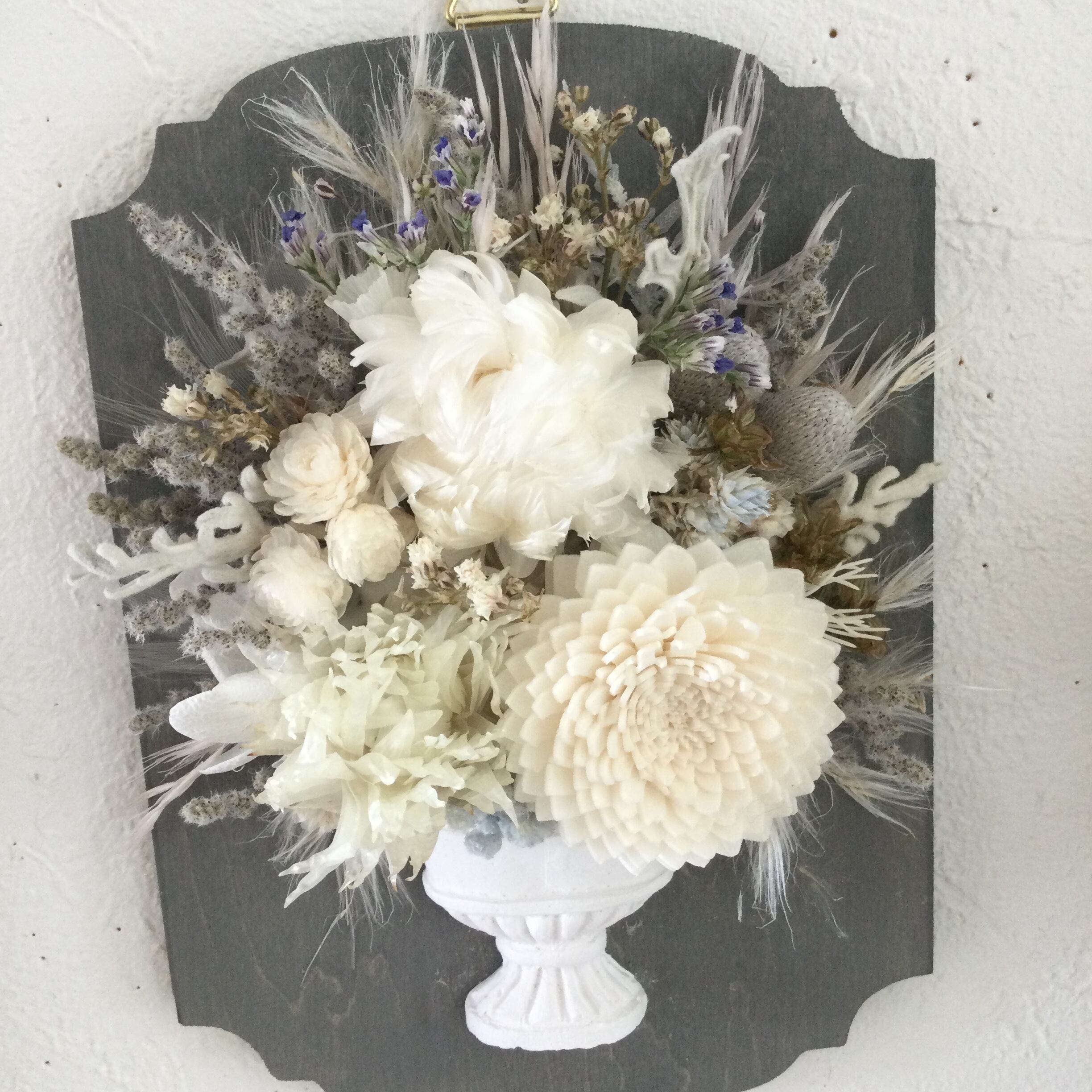 ソラアナスタシア シルバーデージー ヘリクリサムなどナチュラルホワイトのお花をグレーのフレームにアレンジしました。