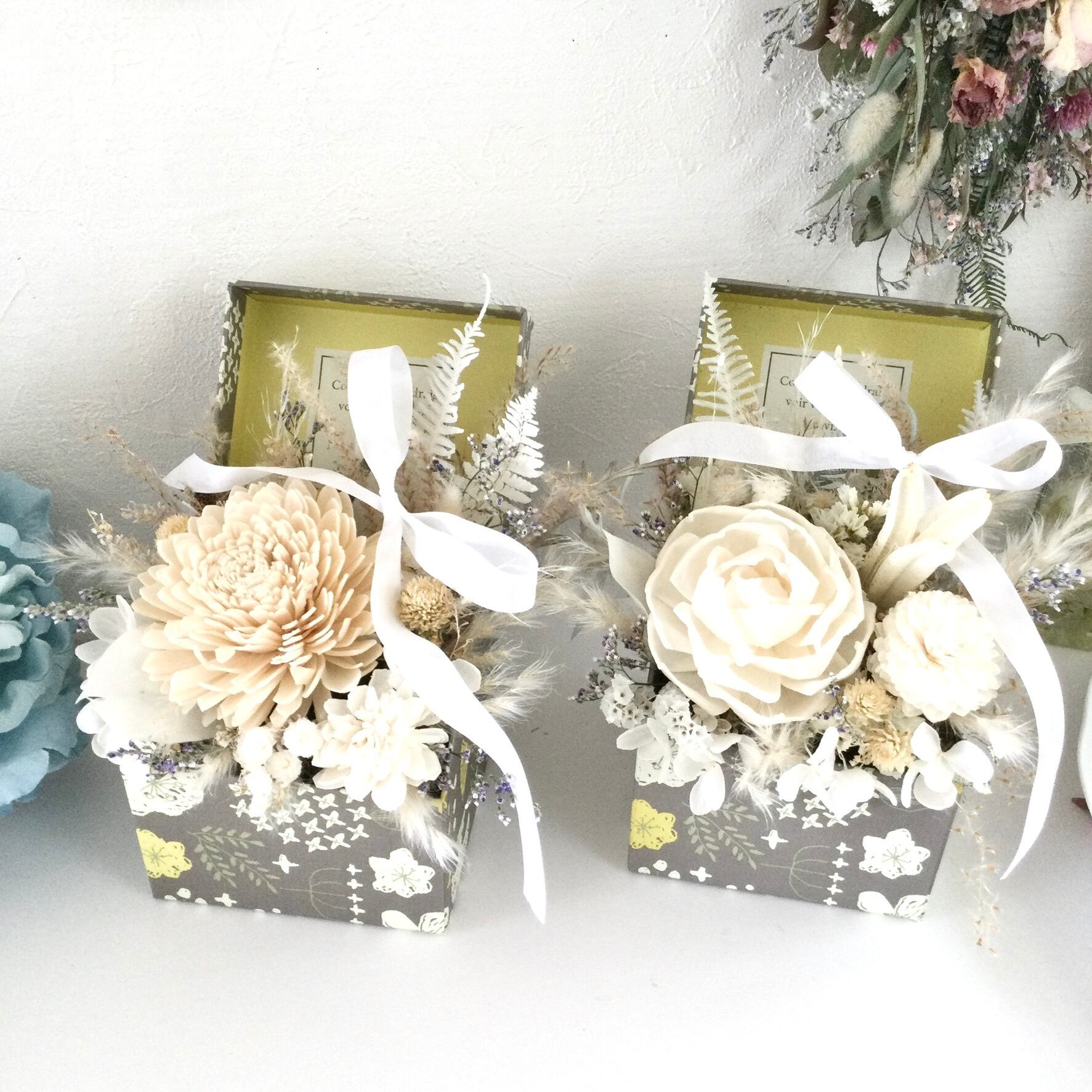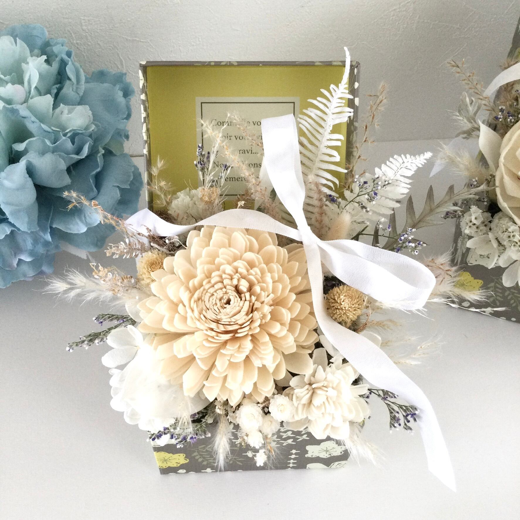 ドライフラワー ナチュラルホワイトのソラダリアと小花のボックスアレンジメントです。