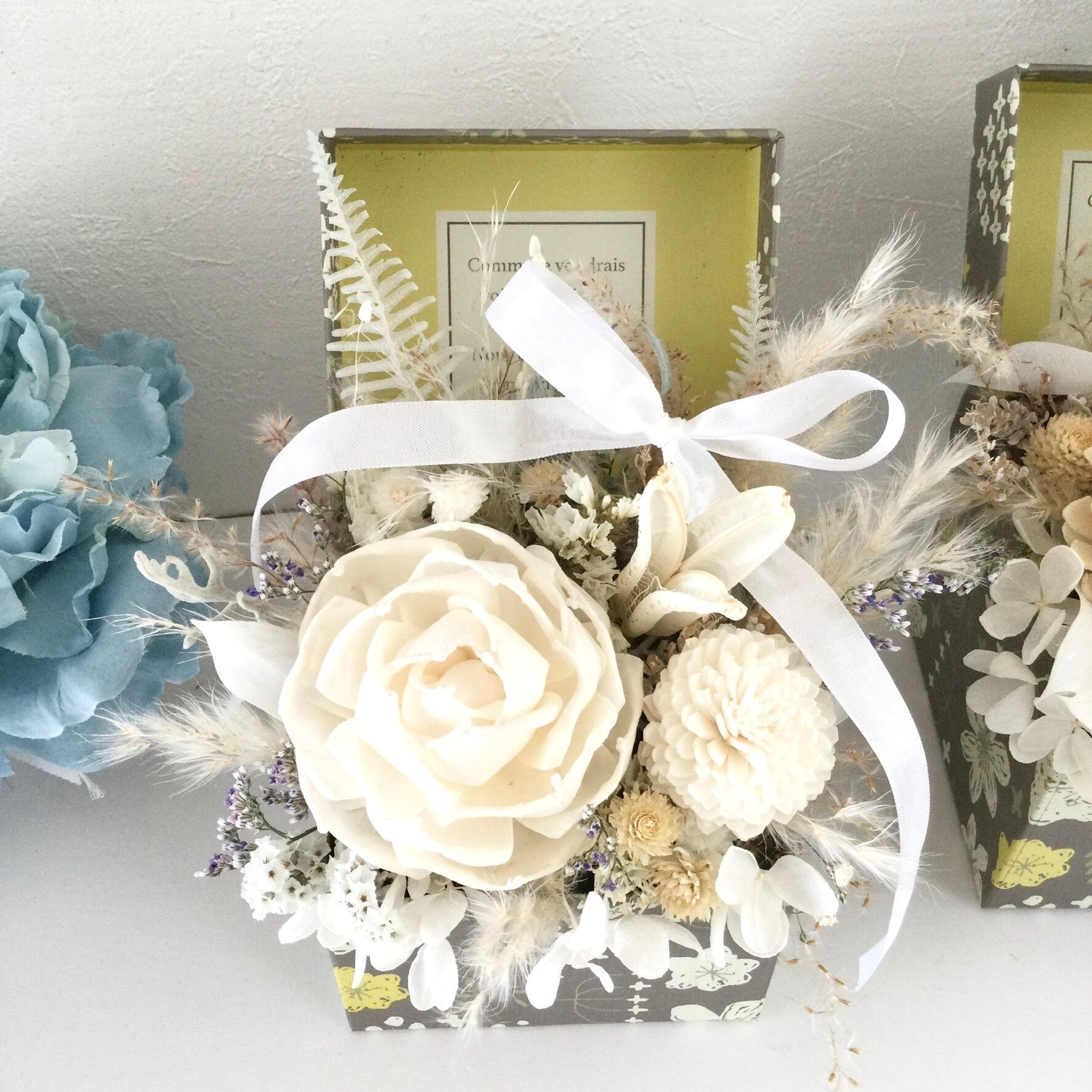ドライフラワー ナチュラルホワイトのソララナンキュラスと小花のボックスアレンジメントです。