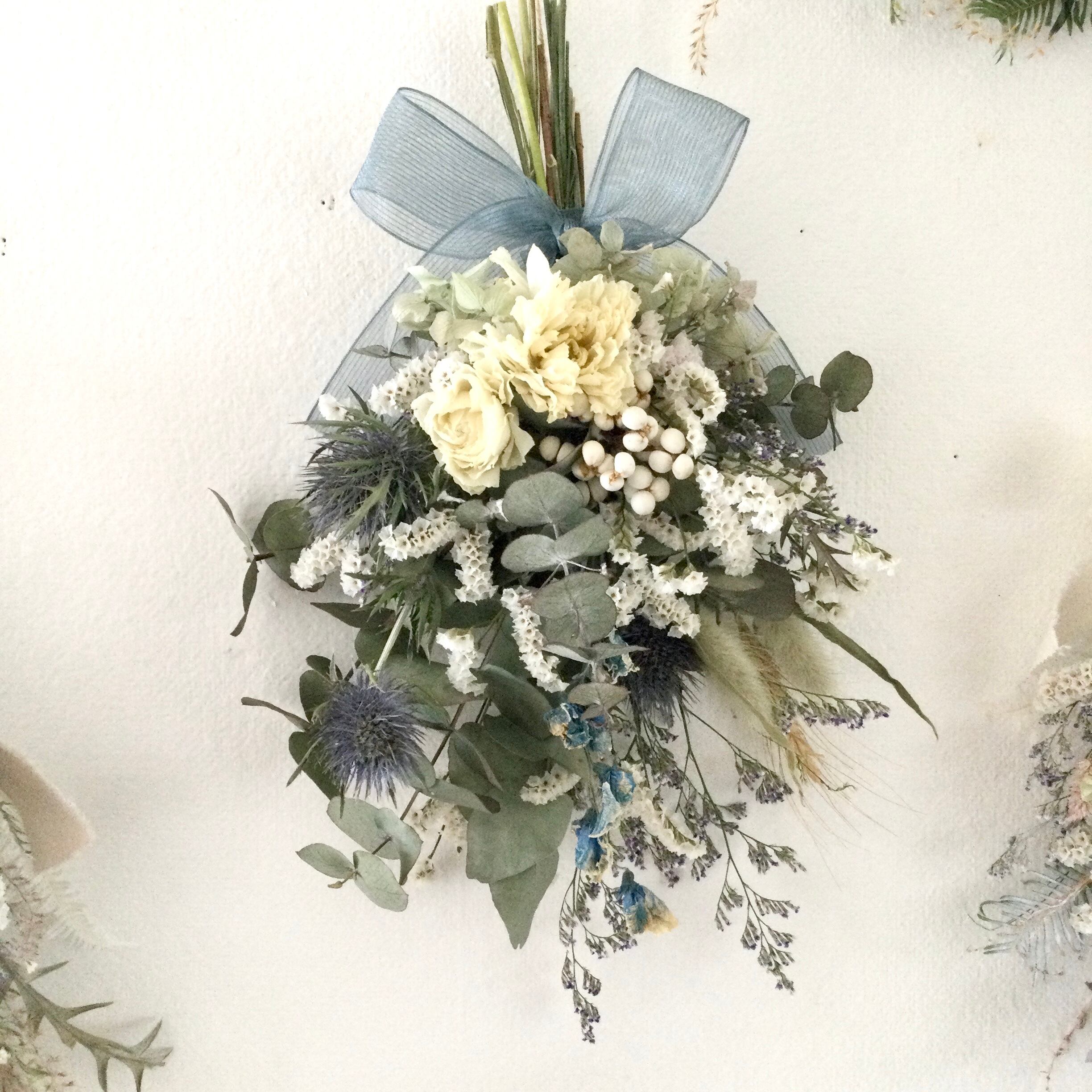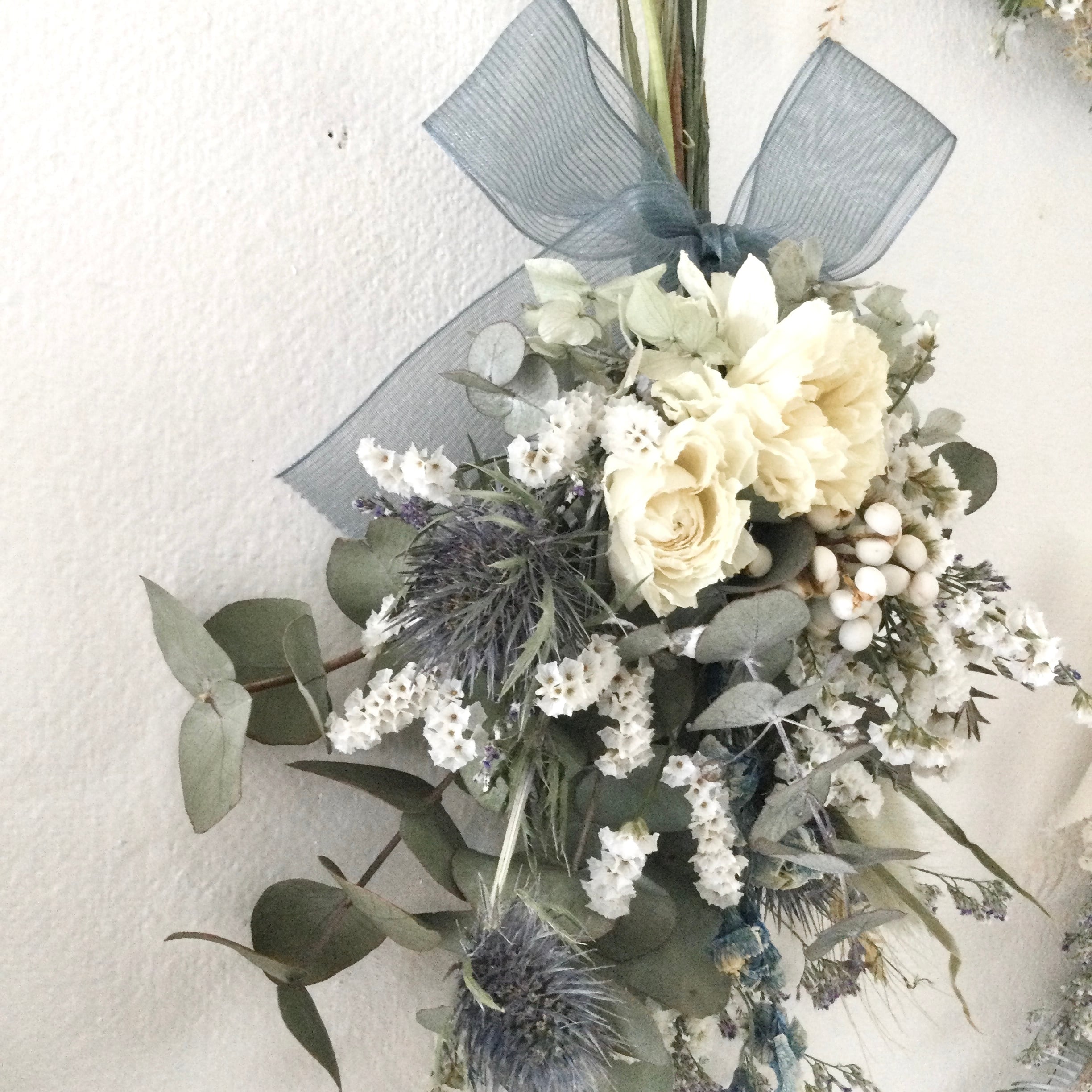 ・花材 ドライフラワー ユーカリ ラナンキュラス 紫陽花 スターチス エリンジューム かすみ草 ブルーファンタジア シダ ラグラス ナンキンハゼ スイートピー ムギ リボン等