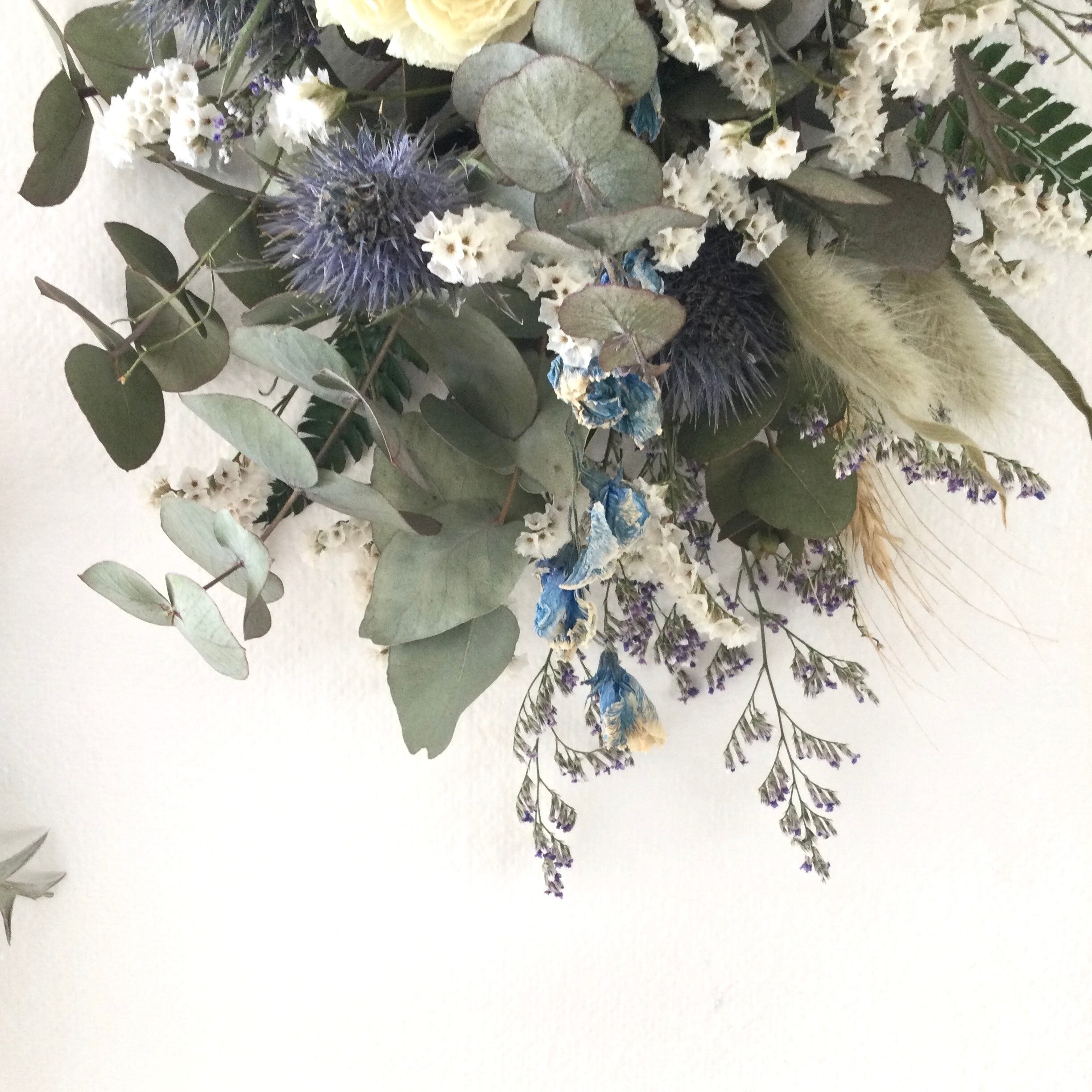 ・花材 ドライフラワー ユーカリ ラナンキュラス 紫陽花 スターチス エリンジューム かすみ草 ブルーファンタジア シダ ラグラス ナンキンハゼ スイートピー ムギ リボン等