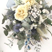 ユーカリとホワイトのラナンキュラス ブルーのエリンジューム ラグラス スターチス スイートピーなどをふんわりまとめました。
