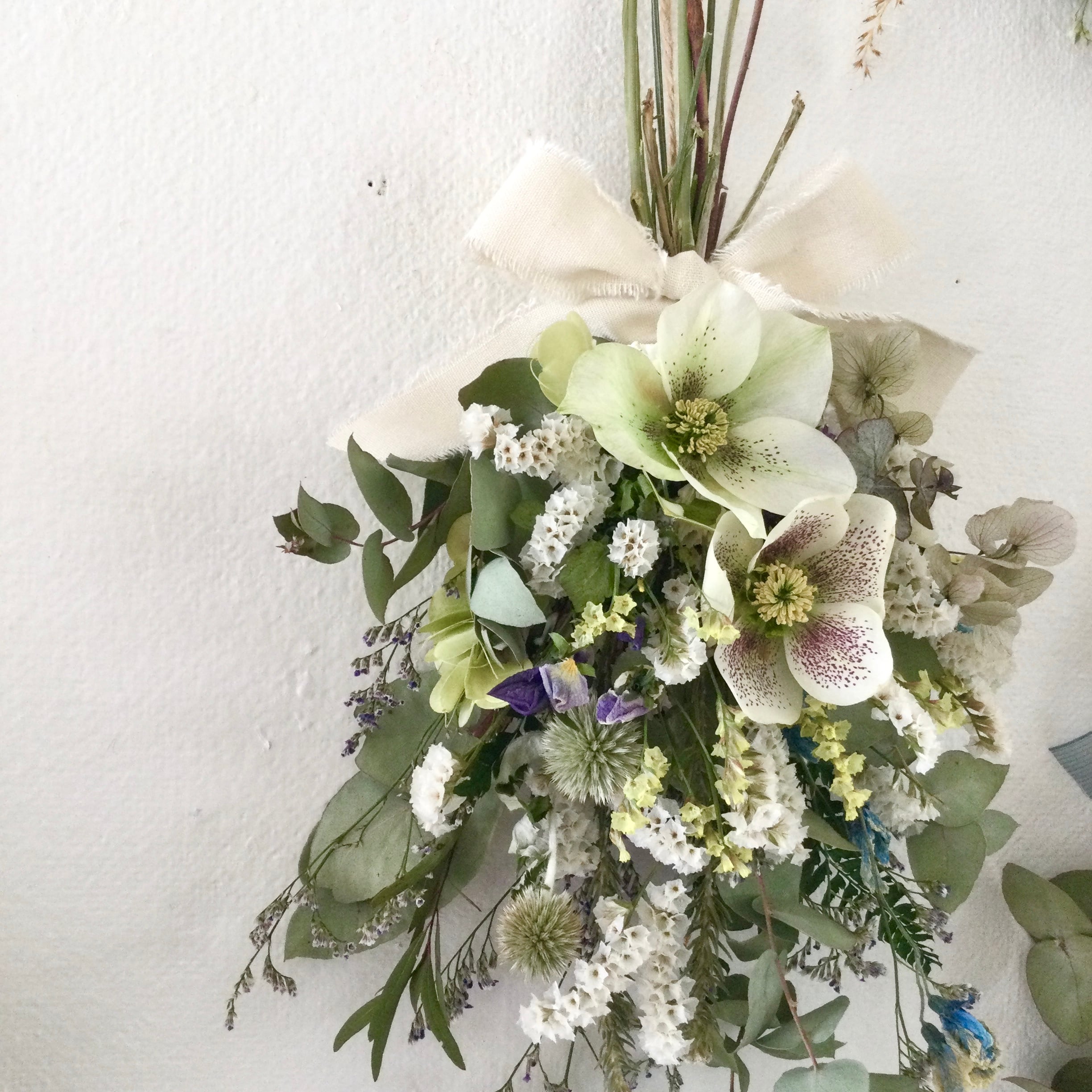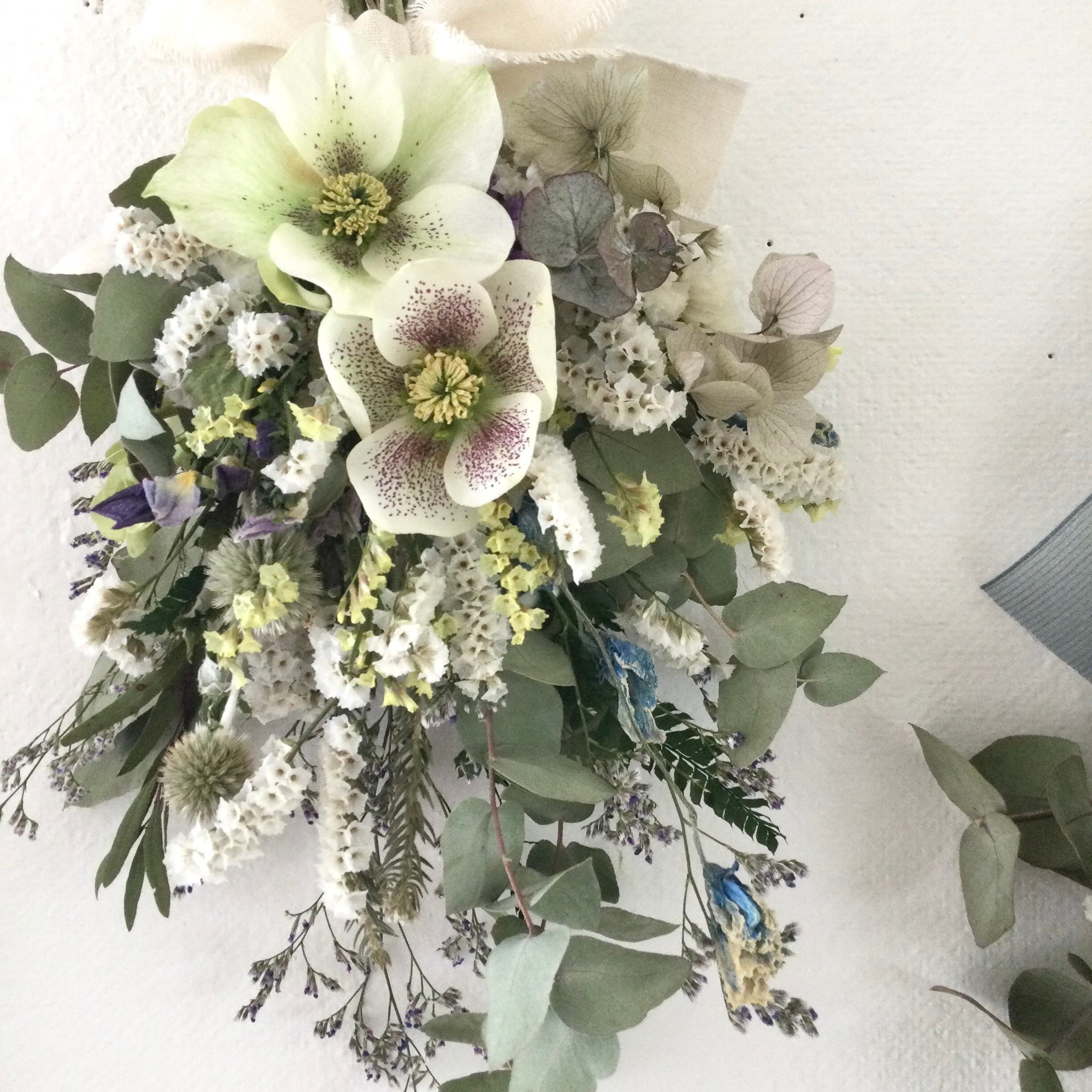 綺麗なお色にドライになったクリスマスローズとユーカリのグリーン ホワイトのスターチス などをふんわりまとめました。