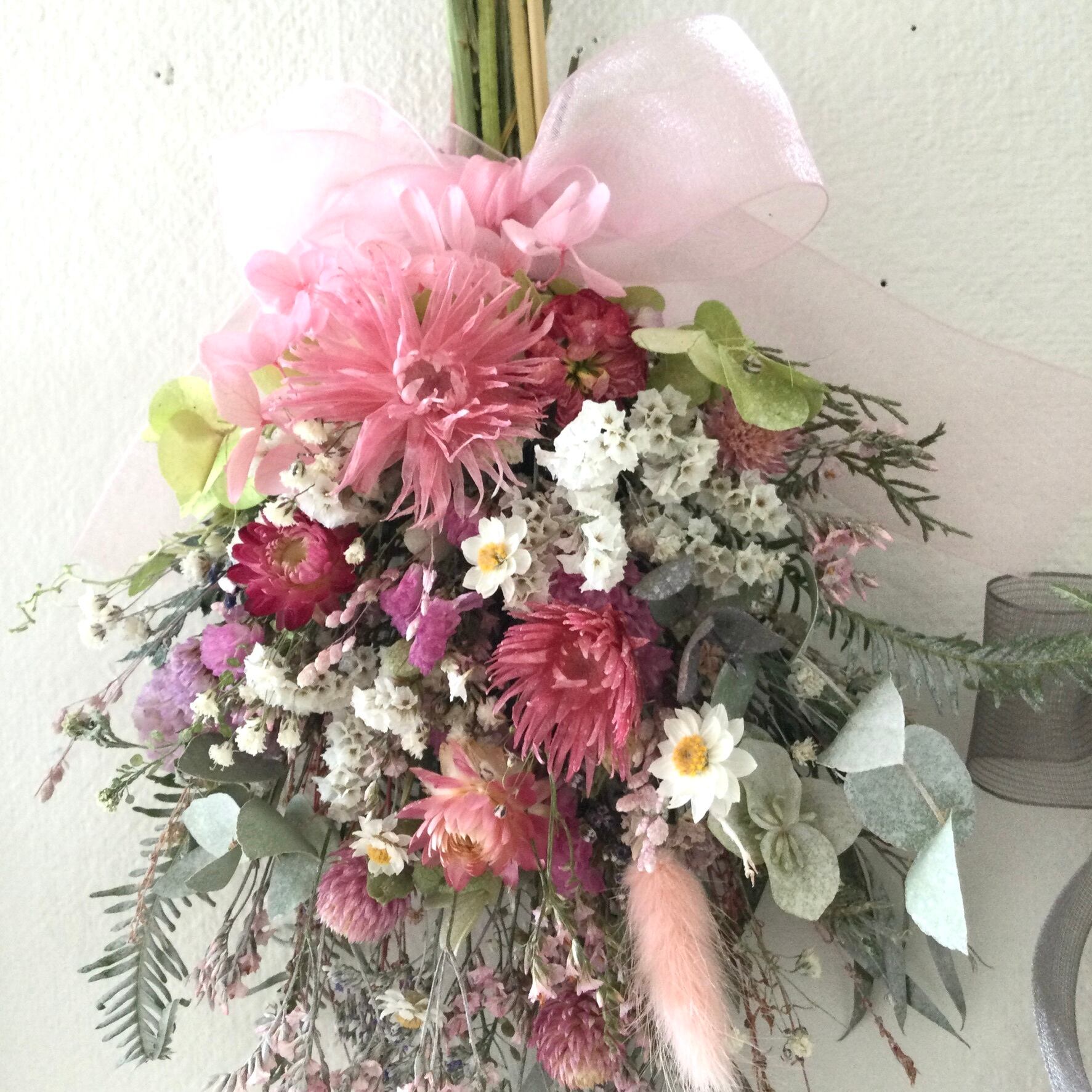 ピンクのヘリクリサム 千日紅 スターチスなどをふんわりまとめました。