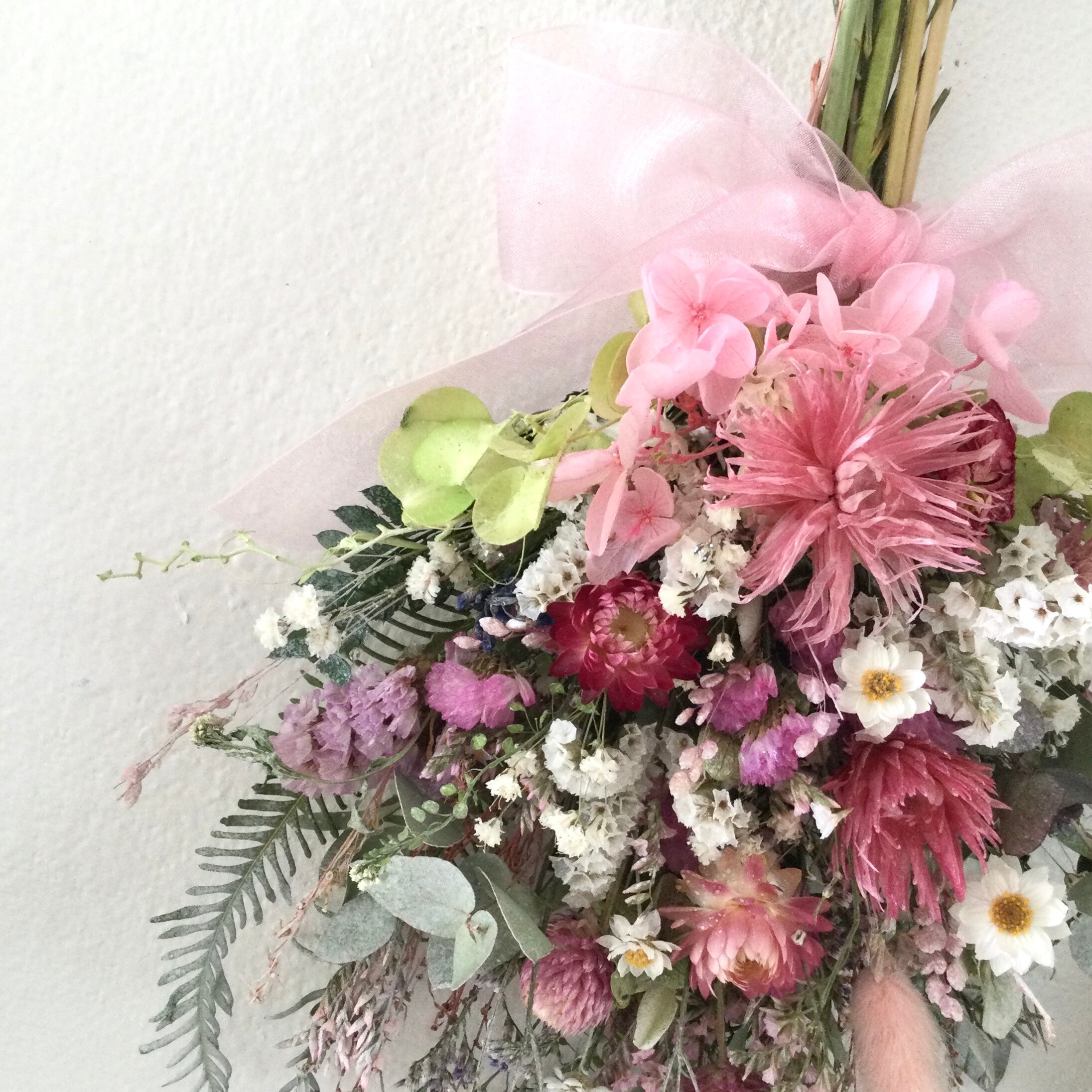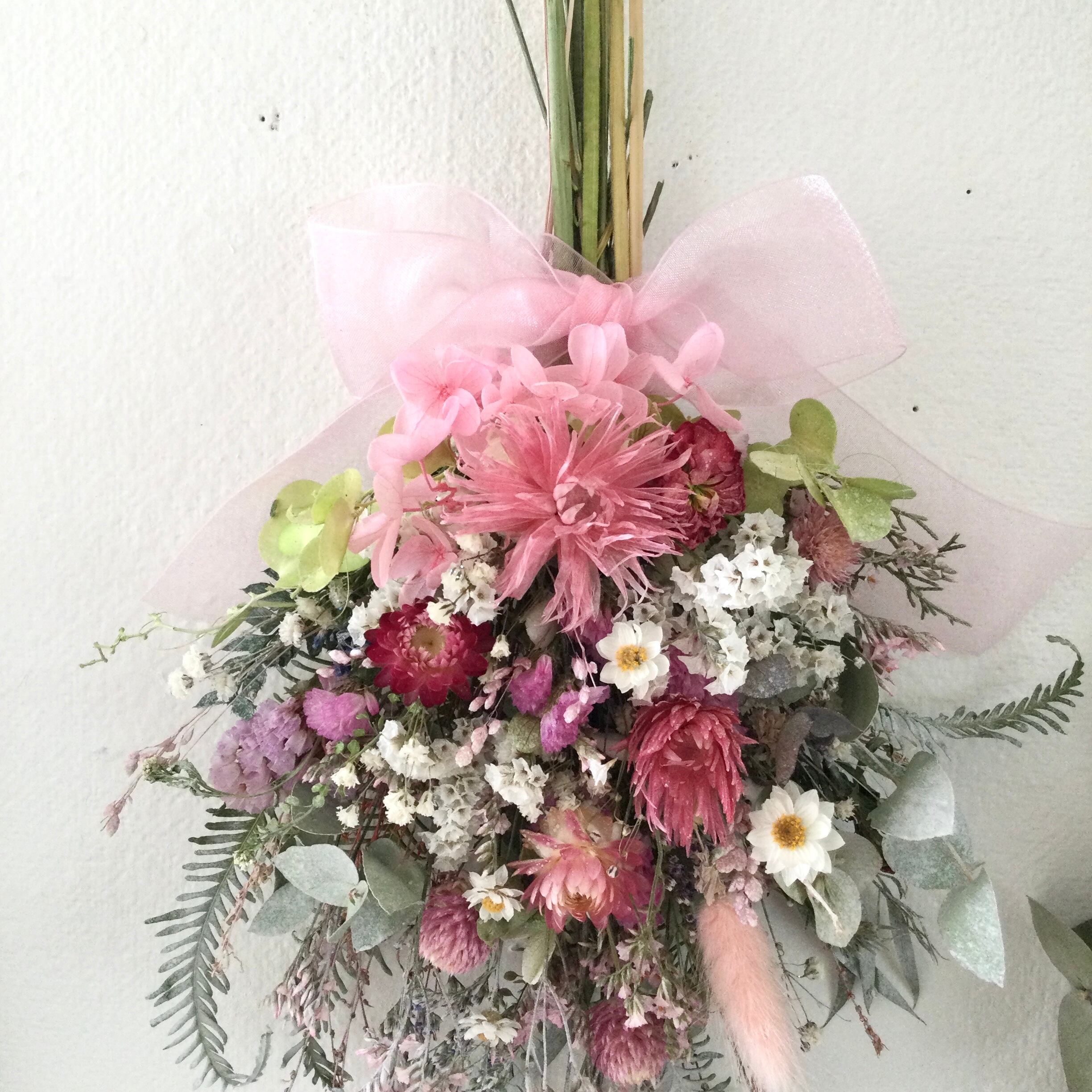 ピンク シルバーデージー と小花のスワッグ ドライフラワー 誕生日プレゼント 引っ越し祝い 記念日 母の日ギフト