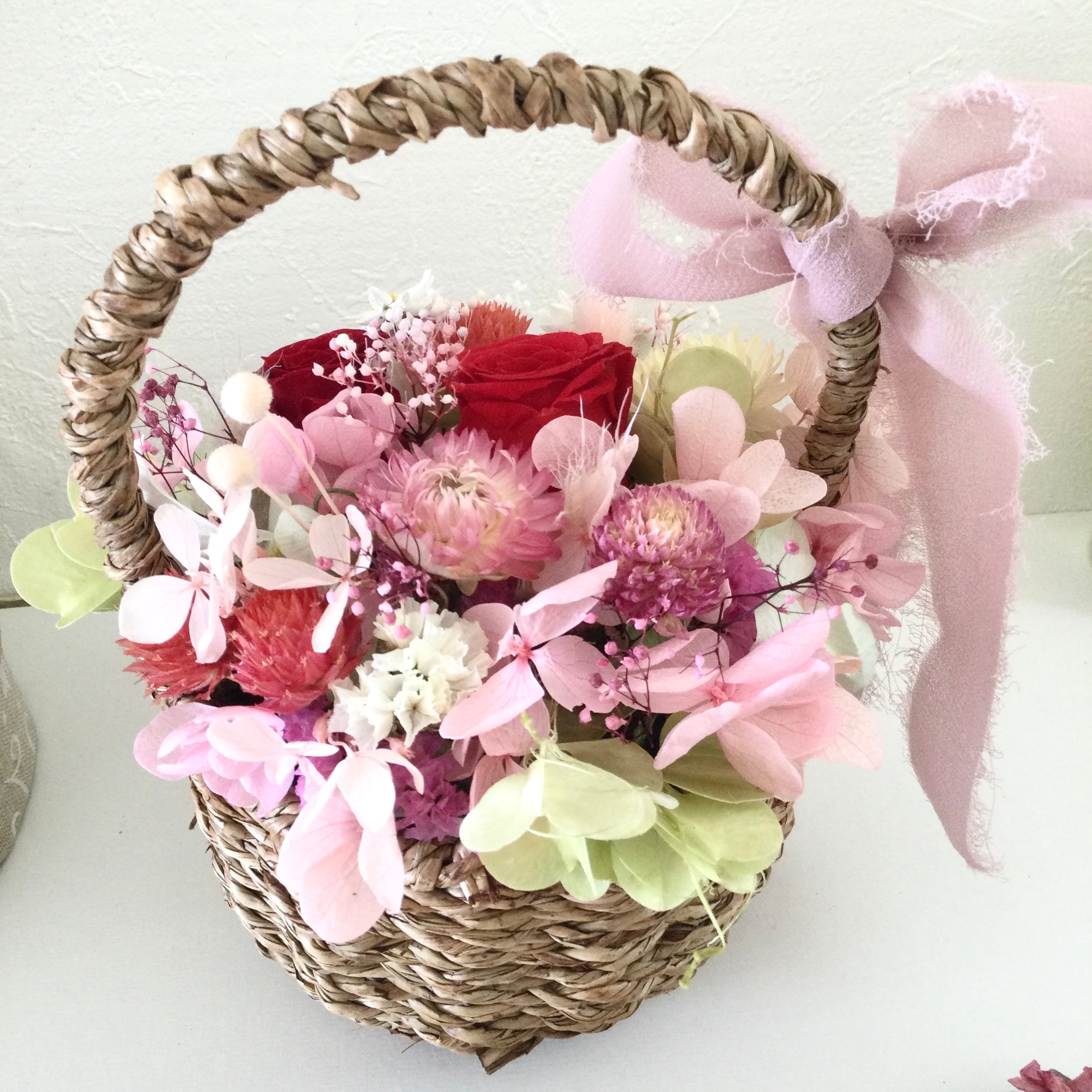 ・花材 ローズ ヘリクリサム 千日紅 イモーテル スターチス 紫陽花 かすみ草 花かんざし パンパスグラス バスケット リボン
