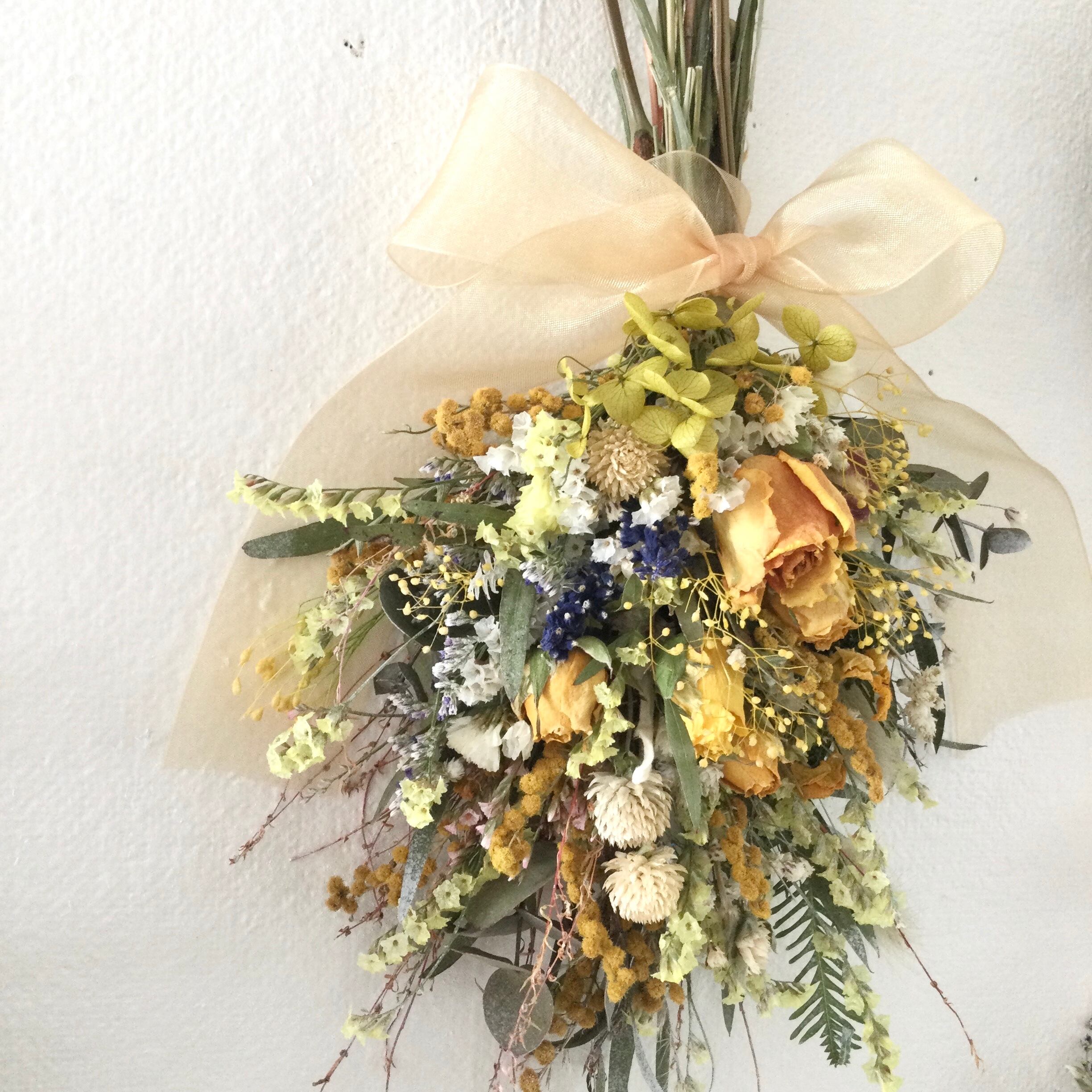 ローズと小花のスワッグ イエロー オレンジ ドライフラワー 誕生日プレゼント 引っ越し祝い 記念日 母の日ギフト
